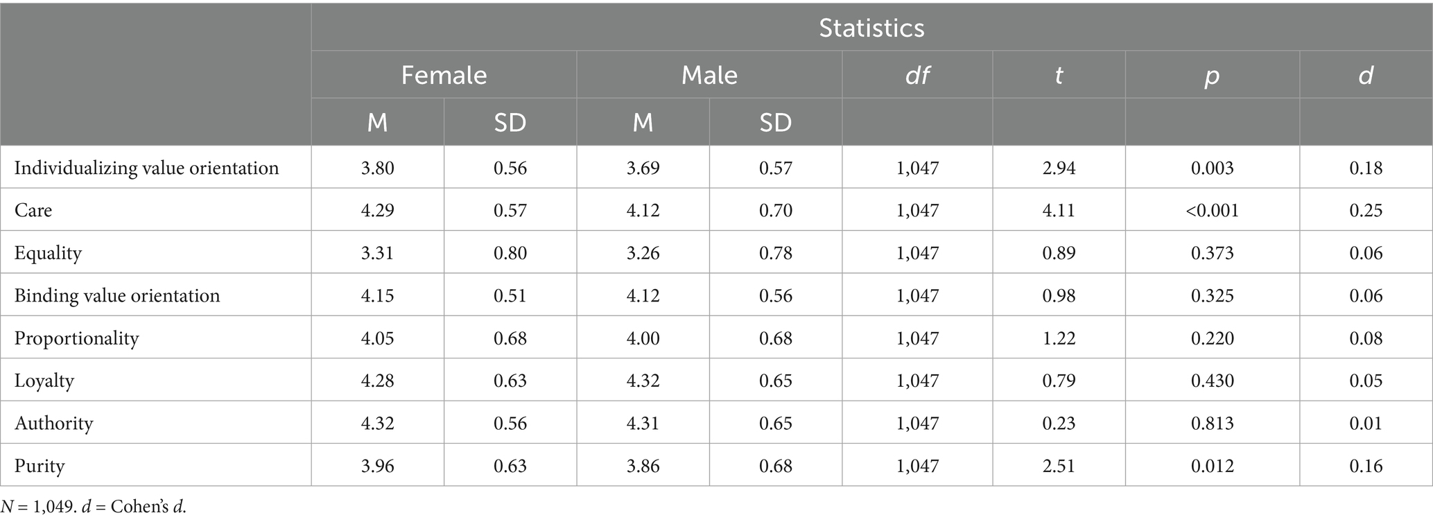 Further analyses of the MFQ-2 for construct validity with gender using t-tests underline the analyses of the correlations (r). See details in Table 4. Female students always score higher, except for the dimension of loyalty. Significant small effects are estimated for the care dimension (t(1047) = 4.11, p < 0.001, d = 0.25). There are also significant effects for the individualizing moral foundation (t(1047) = 2.94, p = 0.003, d = 0.18) and the purity dimension (t(1047) = 2.51, p = 0.012, d = 0.16).