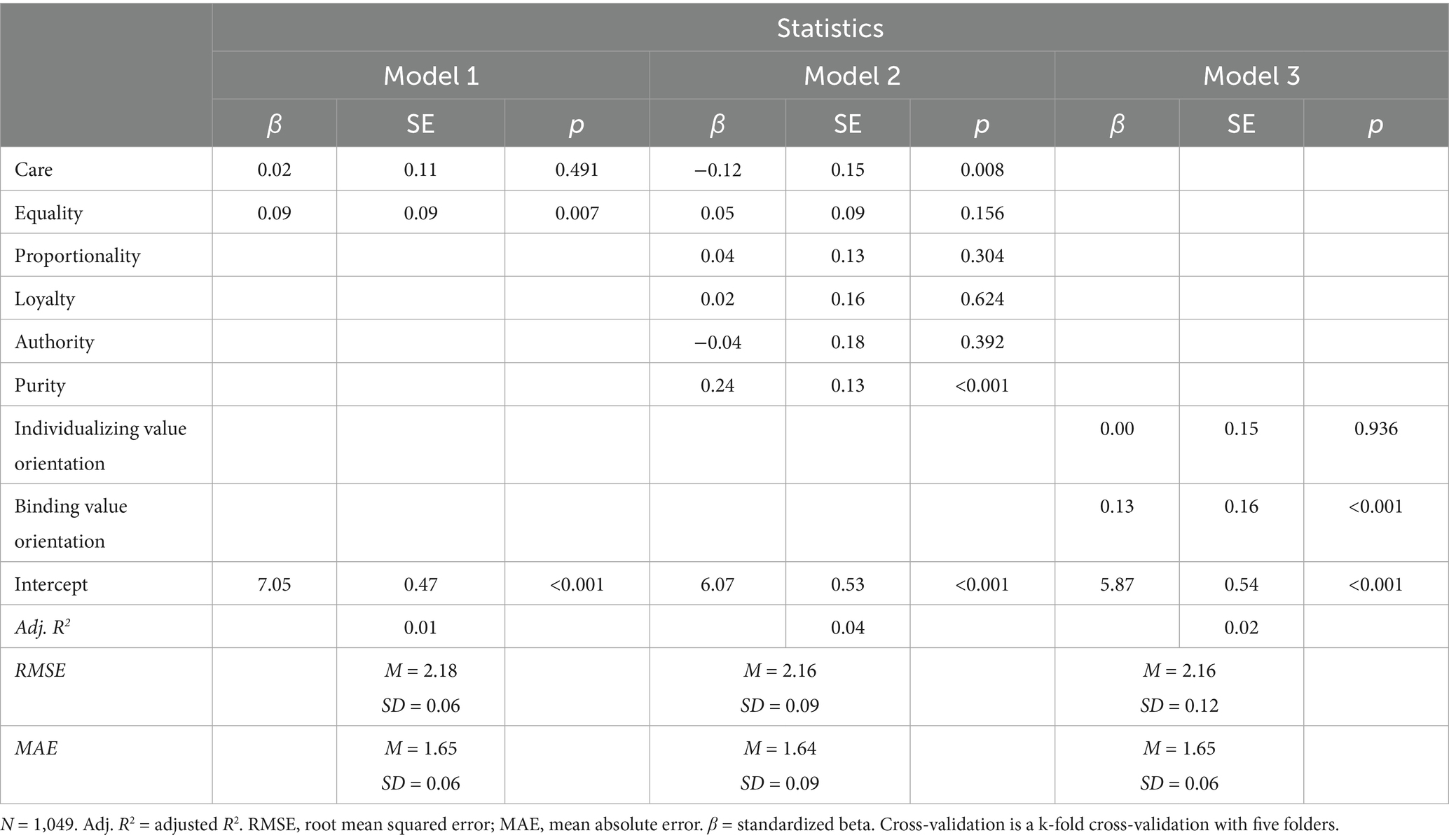 The criteria validity is evaluated through the MFQ-2 instrument and its association with religiosity as well as gender for construct validity. For a first inspection, correlations (r) according to Pearson estimated using values from 0.10 to 0.29 are considered small, between 0.30 and 0.49 as medium, and ≥0.50 as large (Cohen, 1988). A further analysis for gender is done by using t-tests for independent samples, with an effect size of Cohen’s d from 0.20 to 0.49 considered small, between 0.50 and 0.79 as medium, and ≥0.80 as large (Cohen, 1988). For these analyses, the package “psych” (Revelle, 2024) version 2.4.6.26 was used. Multiple regression is used for analyzing the MFQ-2 dimensions on the dependent variable religiosity. A k-fold cross-validation, in our analysis, where we use five folds, is further conducted for evaluating the results through root mean squared error (RMSE) and mean absolute error (MAE). Lower values for RMSE and MAE indicate a better fit as well as prediction accuracy (Hastie et al., 2009; Karunasingha, 2022; Kim and Kim, 2016; Olsen and Delen, 2008). The packages “caret” (Kuhn, 2008) version 6.0.94, “ModelMetrics” (Hamner et al., 2018) version 1.2.2.2, and “Metrics” version 0.1.4 were used. Significance is seen as p < 0.05 (two-tailed).