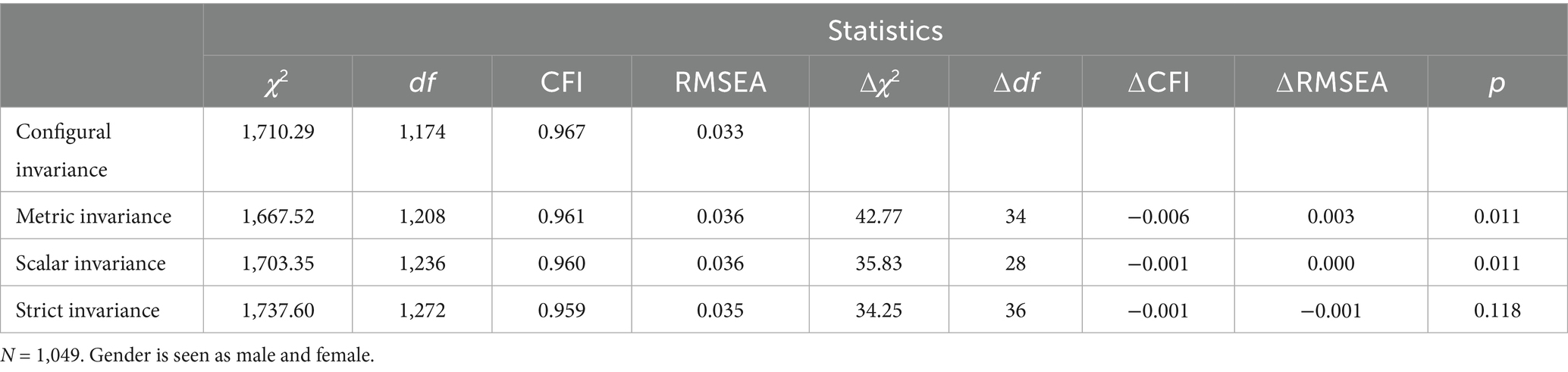 Measurement invariance is tested based on gender. Results are shown in Table 6. Criteria for strict invariance in comparing different models are hit (∆ CFI > −0.010 and ∆ RMSEA < 0.015). Specifically, there are values for ∆ CFI from −0.006 to −0.001 and ∆ RMSEA from −0.001 to 0.003. Consequently, strict invariance is achieved, and mean differences can be compared without restriction (Nießen et al., 2020).