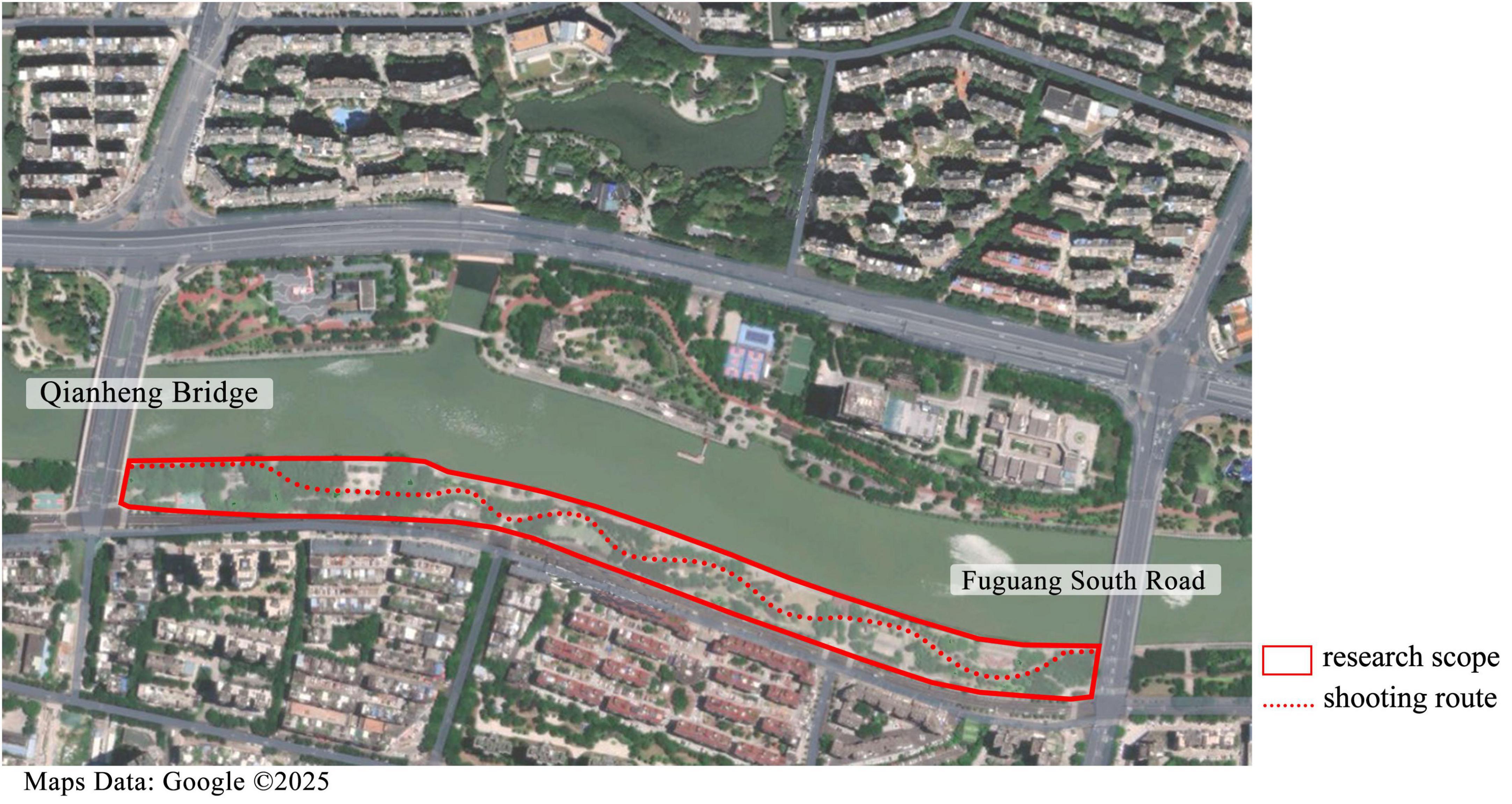The video was shot in June 2023 during a calm, clear, and well-lit morning with minimal pedestrian traffic at Guangming Gang Park in Fuzhou, Fujian Province, China. The section selected for recording spanned from the southern part of Qianheng Bridge to Fuguang South Road (Figure 1), covering an approximate length of 1.2 km. To ensure video stability and accurately replicate the eye level during walking, jogging, and cycling, the GoPro9 action camera (23.6 MP, 2.7K resolution) was mounted on the photographer’s forehead using specialized gear. The entire video duration is 5 min and 20 s.