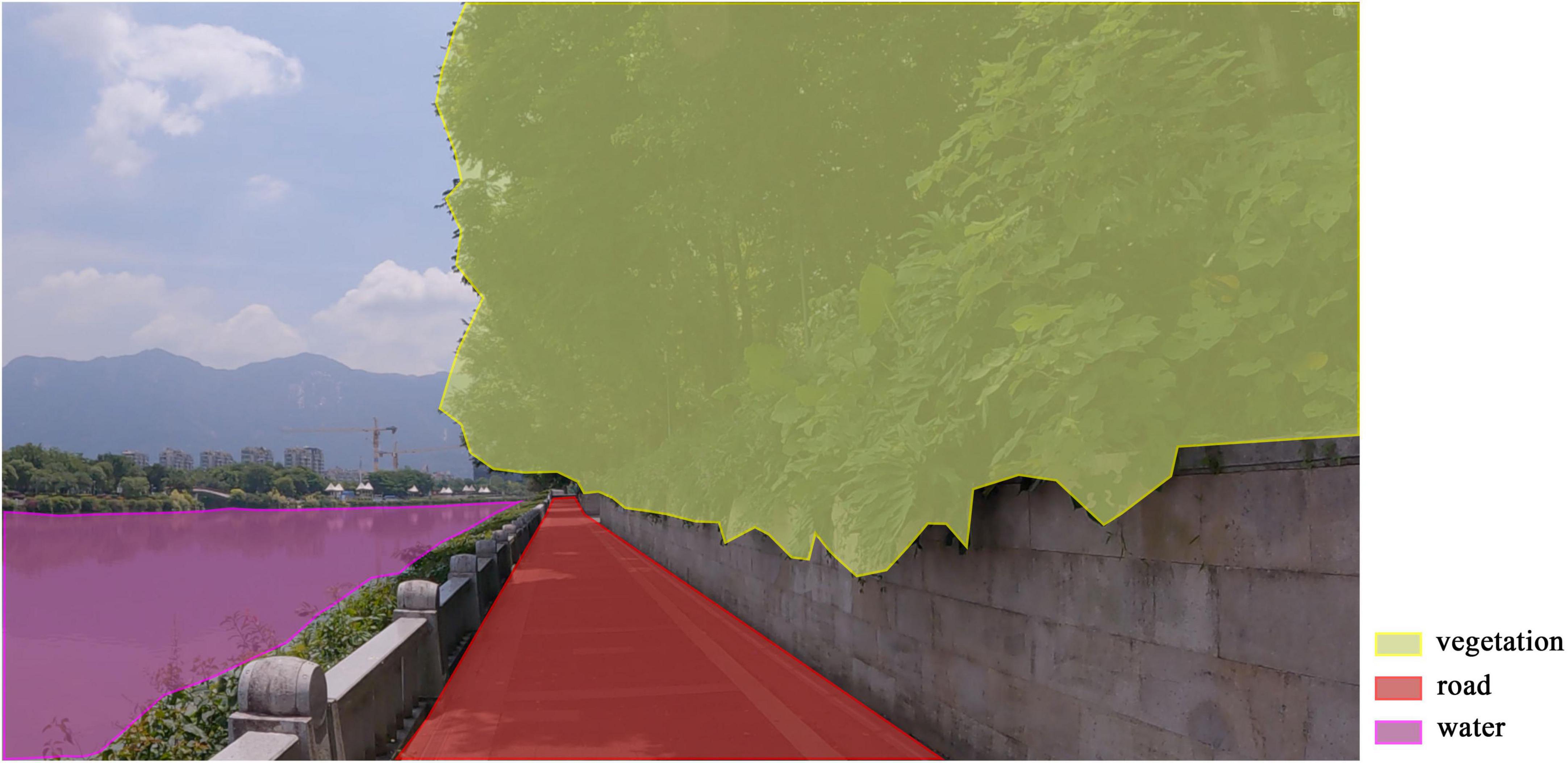 Areas of interest (AOI) refer to specific portions of the visual material that are treated as independent analytical units. In this study, roads, water areas, and vegetation were defined as AOIs for fixation analysis. The researchers imported the video into the ErgoLAB 3.0 platform. Using the AOI tool within the eye-tracking module, a key frame was set every 10 s starting from the first frame to outline AOIs. The software automatically traced and generated AOIs for the intermediate frames. Finally, manual inspection and correction were performed for AOIs that exhibited displacement, overlap, or loss within the frames. The same video was used to delineate AOIs for the three types of PPA, ensuring complete synchronization in the scope and spatial positioning of the AOIs. The figure illustrates the AOI position distribution for a specific frame of the video (Figure 3). Due to the obstruction of water by vegetation or terrain in certain areas, it appears in non-continuous segments. In a 5-min and 20-s video, water is cumulatively visible for 2 min and 28 s, accounting for 46.3% of the total duration. In contrast, plant and road elements remain continuously visible throughout the entire video, with a visibility duration of 100%.
