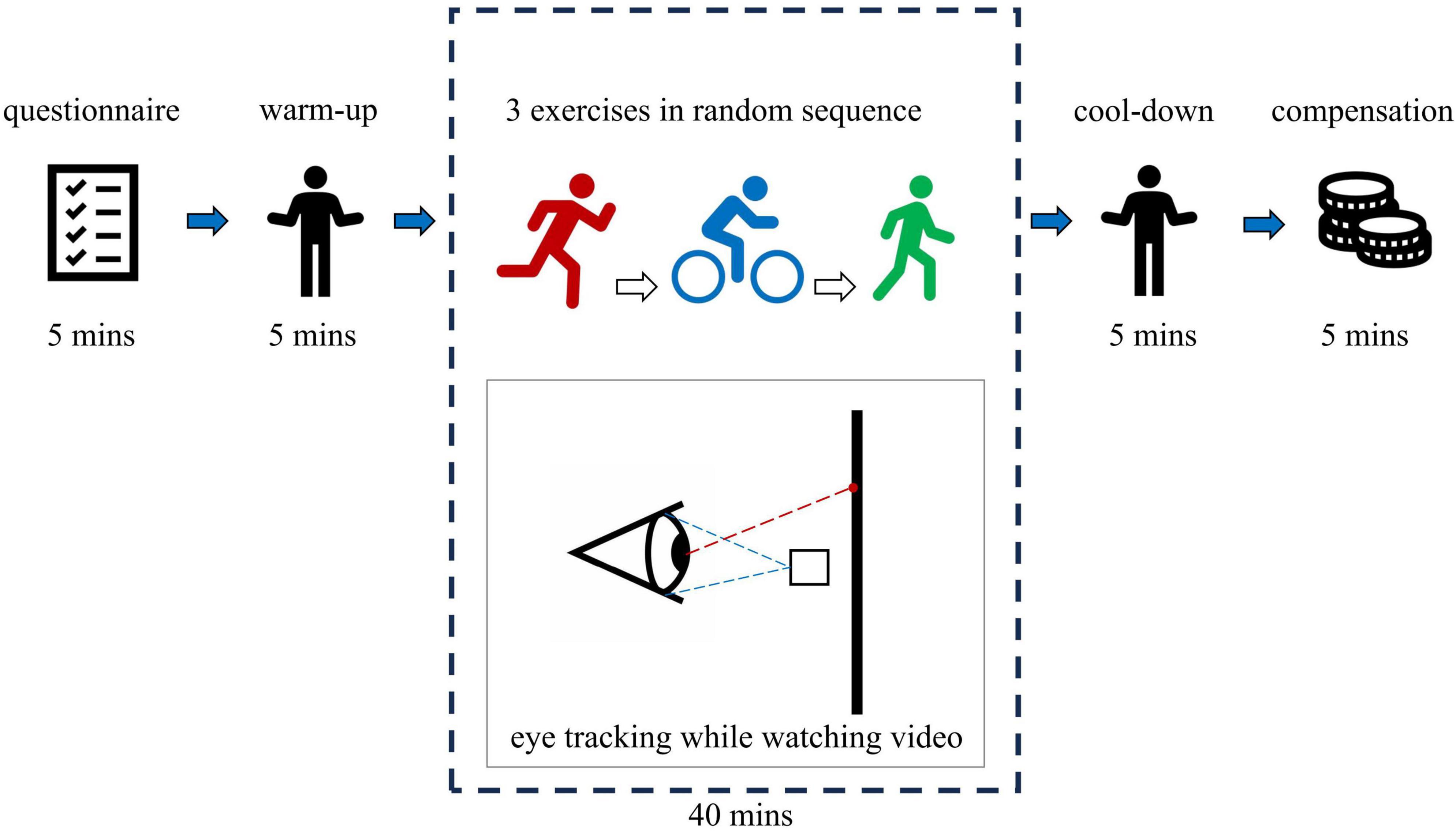 At the beginning of the experiment, each participant was randomly assigned one sequence of the six. After calibrating the eye tracker, the experimenter started the exercise device (treadmill or stationary cycle) and gradually increased its speed to reach the predetermined rate while allowing participants to warm up on the device. After they maintained a steady pace at the designated speed for 1 min, the video began to play. The three PPAs use the same video but vary in time and speed settings. During cycling, video playback lasted 5 min and 20 s at 13.5 km/h. Participants cycled on a stationary bike at a self-selected comfortable pace. The jogging video was played at 0.55× speed, lasting 9 min and 36 s, with both video and treadmill speeds set at 7.5 km/h. The walking video was played at 0.35× speed, lasting 15 min and 12 s, with both speeds maintained at 4.5 km/h. Before each PPA session, calibration of the eye tracker and a warm-up were conducted. Participants were instructed to maintain a steady pace while watching the video, without making significant head movements. Once all three PPAs were completed, participants received their compensation and left. The total experiment time for each participant was approximately 55 min (Figure 4).