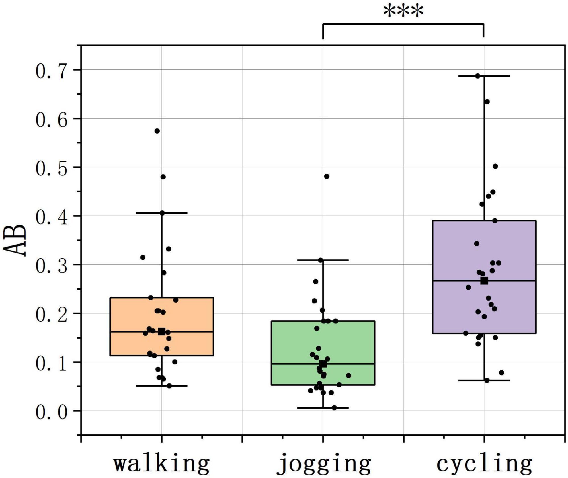 The Kruskal–Wallis test revealed a significant difference in AB among PPAs (H = 17.937, p < 0.001, ε2 = 0.693, Table 1). To identify which two of the three PPAs had differences in activities, pairwise comparisons were conducted with Bonferroni correction. The results indicated that during the entire exercise period, the AB during cycling was significantly higher than during jogging (Figure 5, p < 0.001), suggesting that individuals engaged in jogging exhibited a higher blinking frequency during physical activity.