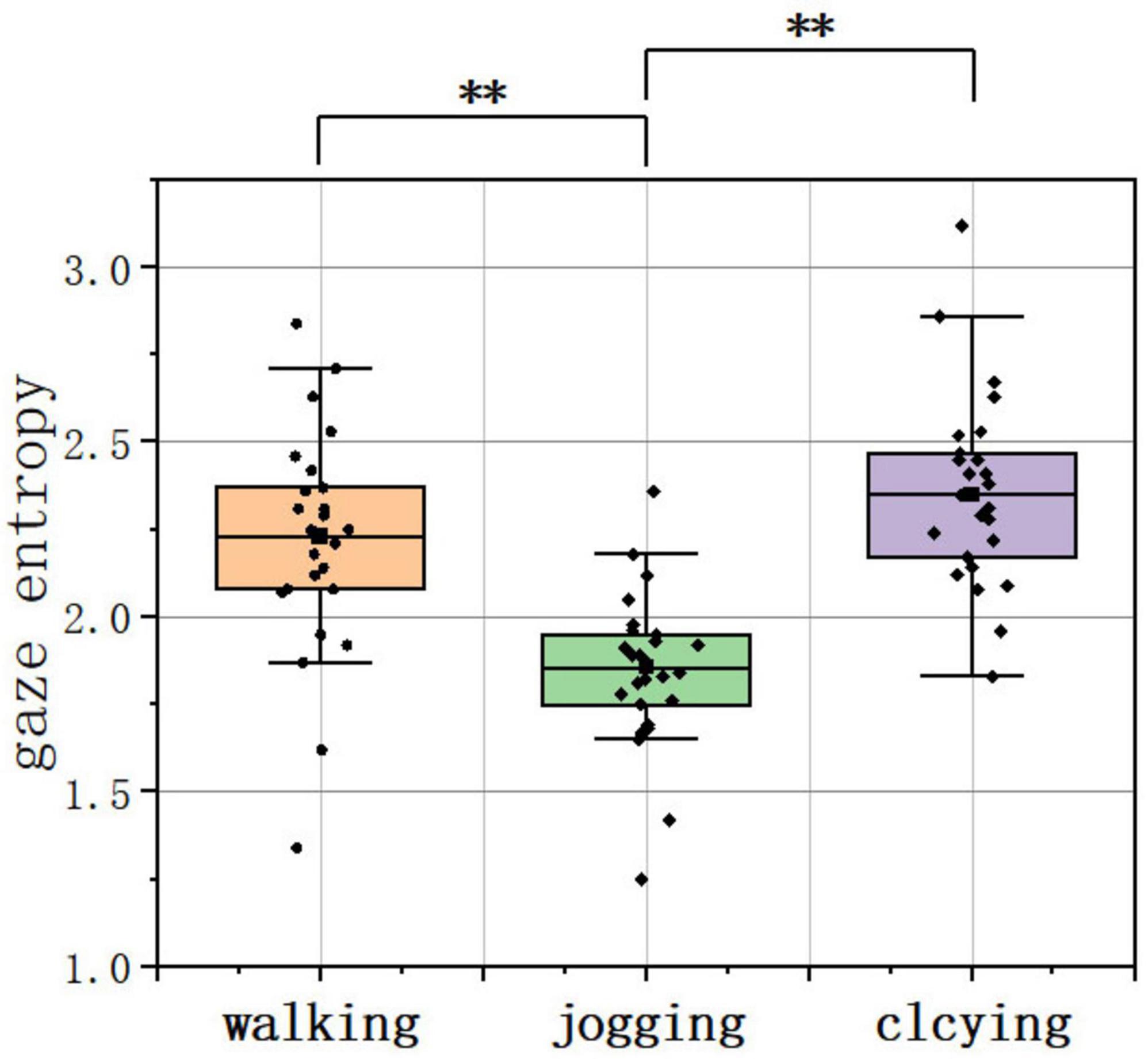 The Kruskal–Wallis test on gaze entropy revealed significant differences among the three PPAs. Pairwise comparisons showed that joggers had significantly lower entropy than walkers and cyclists (p < 0.01, Figure 6), indicating greater attentional focus during jogging.