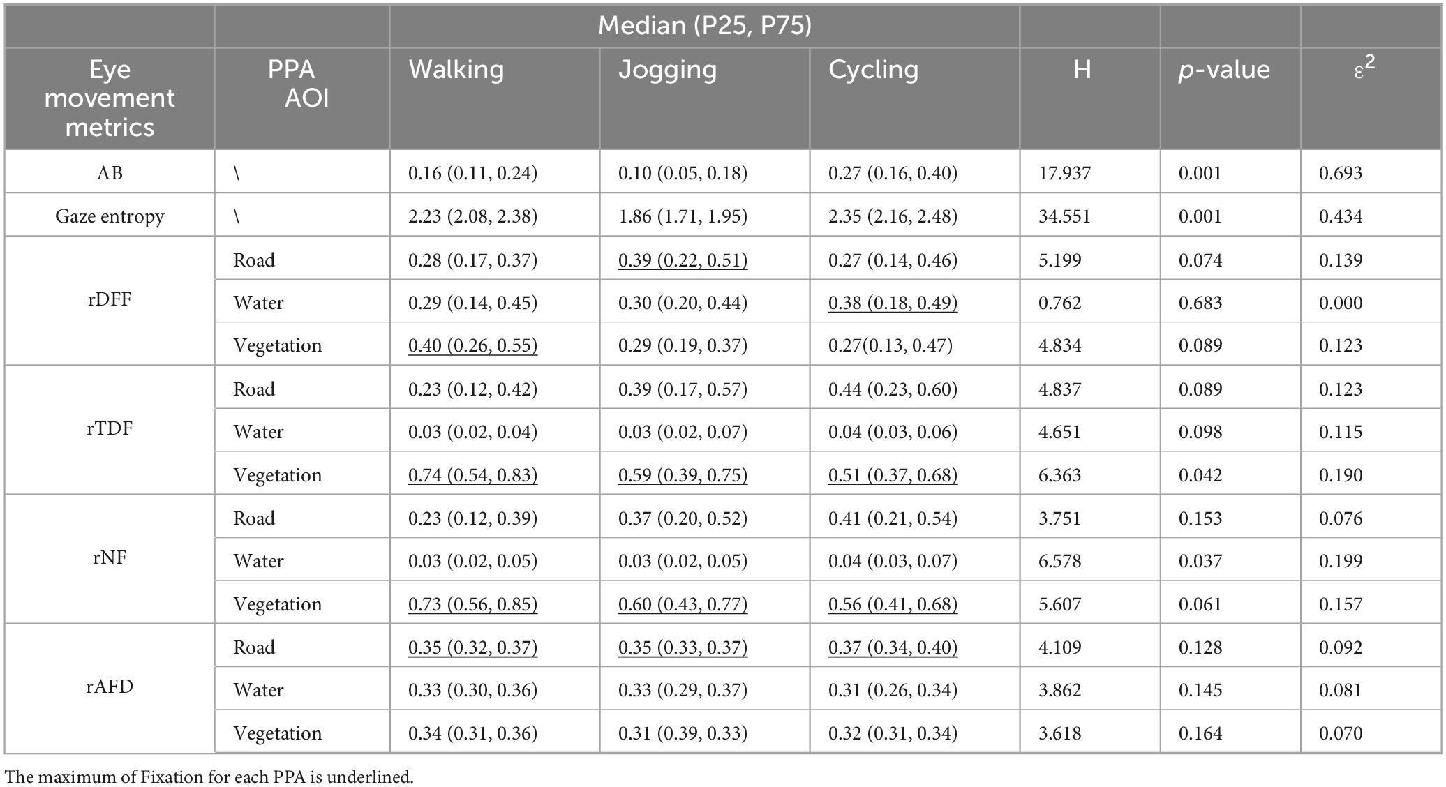 Although no significant differences in fixation metrics on road, a comparison of the medians revealed that roads consistently showed the highest rAFD among the three PPAs. Moreover, joggers exhibited the maximum rDFF while running on roads (Table 1).