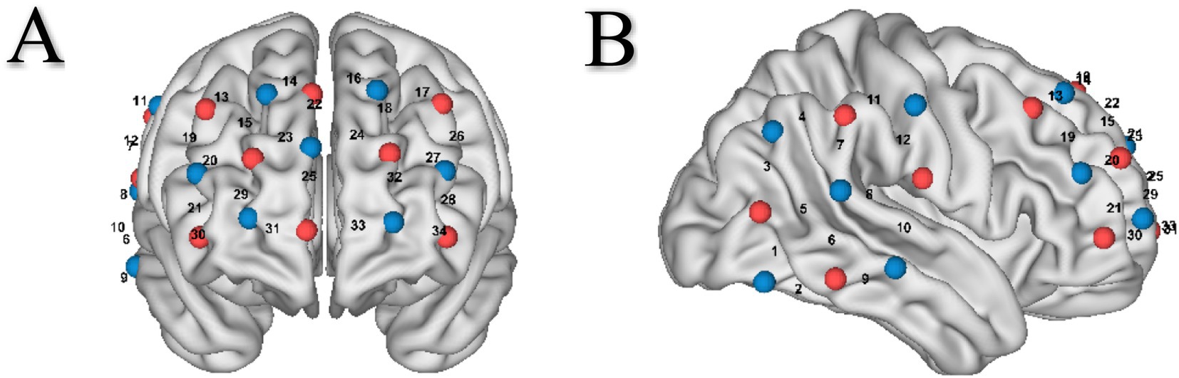A NirSmart-5000A system (Danyang Huichuang Medical Equipment Co., Ltd., China) was used to continuously measure and record the concentration changes of brain oxygenated hemoglobin (HbO) and deoxyhemoglobin (HbR) during the task. The system consists of a near-infrared light source and avalanche photodiodes as detectors, with wavelengths of 730 nm and 850 nm, respectively, and a sampling rate of 11 Hz. As previous studies have indicated that the prefrontal cortex and right temporal/parietal regions are associated with creative idea generation and social interaction (Xue et al., 2018; Lu et al., 2018), we mainly focused on these brain regions. One 3 × 5 optode probe set (seven emitters and eight detectors; 3 cm optode separation) consisting of 22 measurement channels was placed over the prefrontal cortex of each participant. Meanwhile, one 3 × 3 optode probe set (five emitters and four detectors; 3 cm optode separation) consisting of 12 measurement channels was placed over the right temporal and parietal regions of each participant (Figure 2).