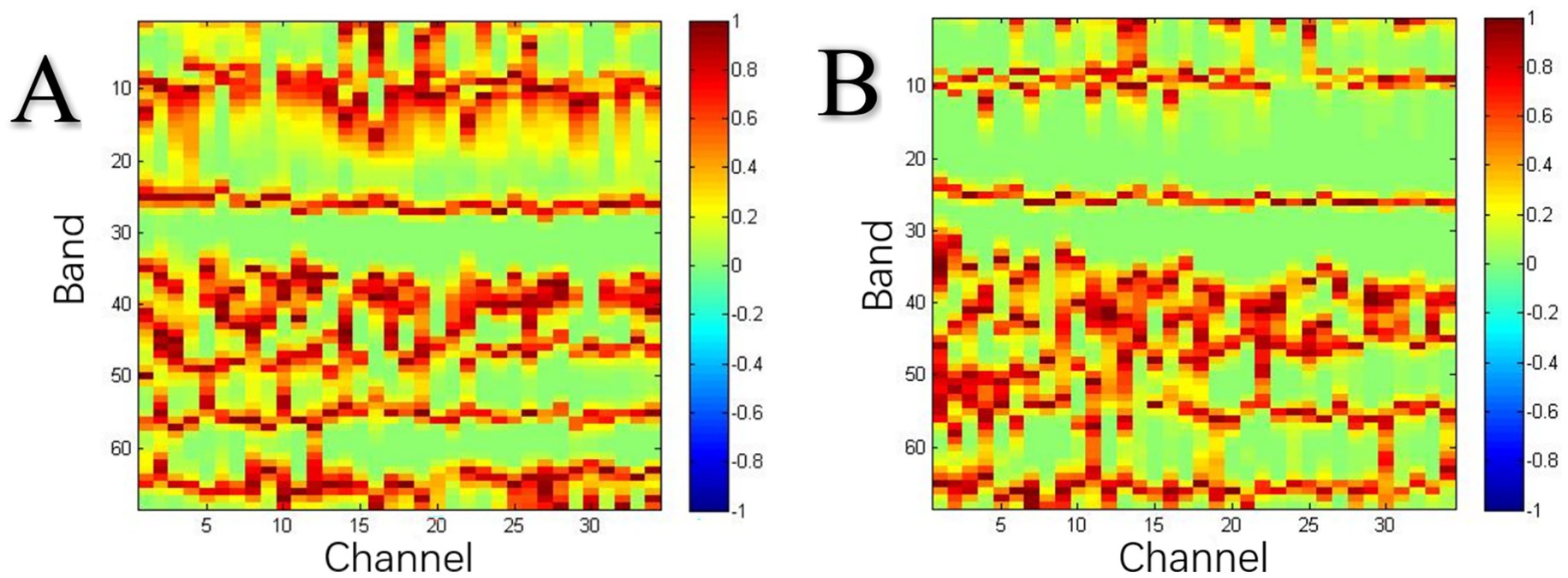 Figure 3. (A) Frequency bands of interest of the social motivation non-diversity group. (B) Frequency bands of interest of the social motivation diversity group.