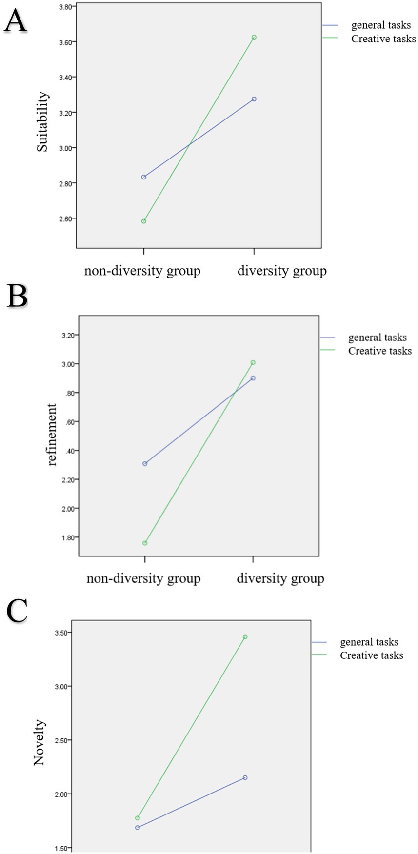In addition, we found that the interaction between social motivation diversity and task type was significant in novelty, suitability and refinement, but not in completeness, indicating that task type can also affect the effect of social motivation diversity on group creativity.