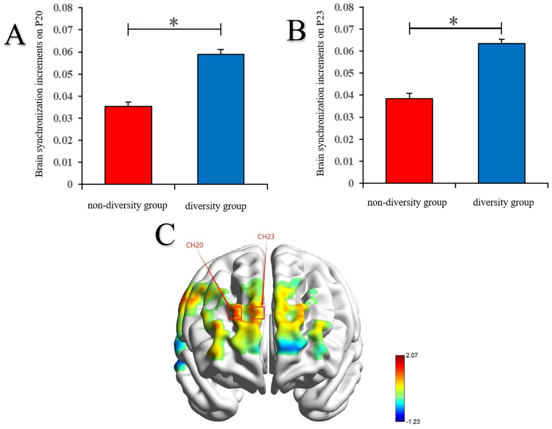 Neuroimaging results showed that members of the socially motivated diversity group exhibited higher brain synchrony increments (IBS) between the CH20 and CH23 channels located in the prefrontal cortex than the socially motivated non-diversity group during the task.