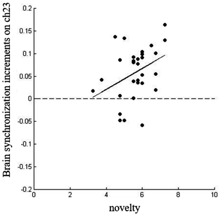 We conducted a Pearson product difference correlation analysis on the IBS increment and group creativity levels of the social motivation non-diversity group and the social motivation diversity group at channels 20 and 23. The results showed no significant correlation within the social motivation non-diversity group (puncorr > 0.05) but there was a significant correlation within the social motivation diversity group: specifically, the novelty dimension of group creativity was significantly and positively correlated with the IBS increment on channel 23 (r = 0.37, puncorr = 0.043; see Figure 6).