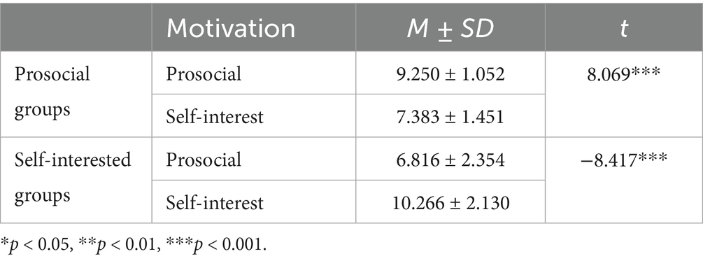 Social motivation was tested by the independent sample t-test. Table 1 shows the results for the prosocial motivation and self-interested motivation groups on the social motivation scale.