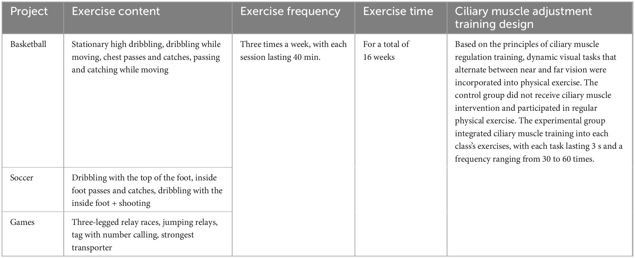 This study employed physical exercises with additional visual tasks, incorporating the principles of ciliary muscle accommodation training. Dynamic visual tasks, which require alternating near and far vision, were integrated into the exercises. The research indicates that incorporating visual training into physical exercises, with dynamic visual stimuli presented for 3 s, yields the best results for improving elementary students’ vision (Zhou et al., 2023). Visual acuity can be categorized into uncorrected distance visual acuity (UDVA) and kinetic vision acuity (KVA). Uncorrected distance visual acuity (UDVA) refers to the measured vision that has not been corrected by any optical lens. Kinetic vision acuity (KVA) refers to the eye’s ability to perceive details of moving objects. Different frequencies of ciliary muscle exercises have varying effects on students’ vision: high-frequency exercises (60 times) significantly enhance UDVA, mid-frequency exercises (30 times) better improve KVA, and low-frequency exercises (15 times) slow the rate of vision deterioration (Yin et al., 2022b). Therefore, this study designed an experimental protocol that included 30 repetitions of near-far vision alternation with a 3 s presentation time, scientifically integrating visual tasks into ball games and physical education activities.