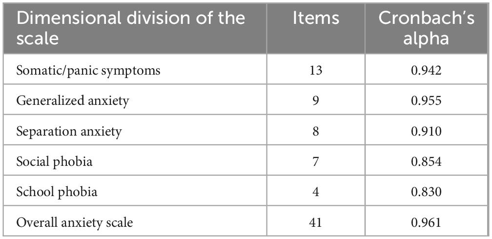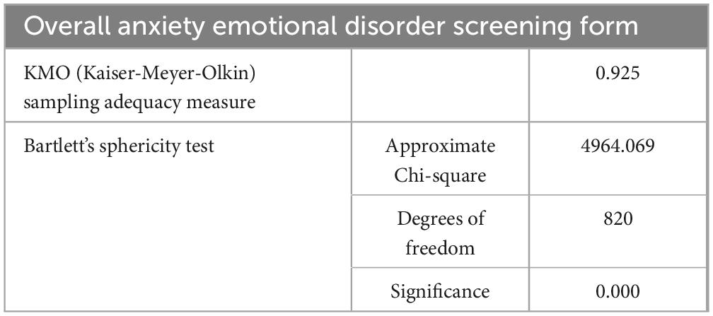 Before the intervention, the reliability and validity of SCARED were assessed. The results are presented in Tables 3, 4. The Cronbach’s alpha coefficients for the overall anxiety scale and its dimensions were all greater than 0.7, indicating good internal consistency among the items and, consequently, high reliability of the scale. The Kaiser-Meyer-Olkin (KMO) value was 0.925 (greater than 0.7), and the Bartlett’s test of sphericity was significant (p < 0.05), further confirming the validity of the scale. These findings are consistent with the reliability and validity results of the SCARED urban norms in China (Wang et al., 2002).