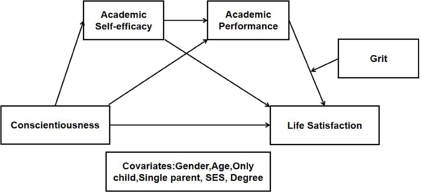 Academic self-efficacy beliefs touched virtually every aspect of students’ lives—whether they thought productively, pessimistically or optimistically, which suggested that students would choose to engage in activities in which they felt competent and avoided those in which they did not (Pajares, 2001). ASE had been shown to be related to conscientiousness (Lee and Klein, 2002) and LS (Pinquart et al., 2004). Besides, one of the most important learning outcomes for students (Dogan, 2015), academic performance, which referred to the level of success a student achieved in their educational pursuits (York et al., 2015), also presented the same characteristics as ASE’s connection with conscientiousness and LS. It had been shown that more conscientious students usually achieved better academic performance (Chamorro-Premuzic and Furnham, 2003; Heaven et al., 2007), which in turn lead to higher life satisfaction (Van Petegem et al., 2007). In addition, the causal relationship between ASE and AP had been repeatedly confirmed to be strong (Richardson et al., 2012). Based on the above previous research results, ASE and AP were likely to play a mediating role in the causal relationship between conscientiousness and life satisfaction, either separately or jointly.