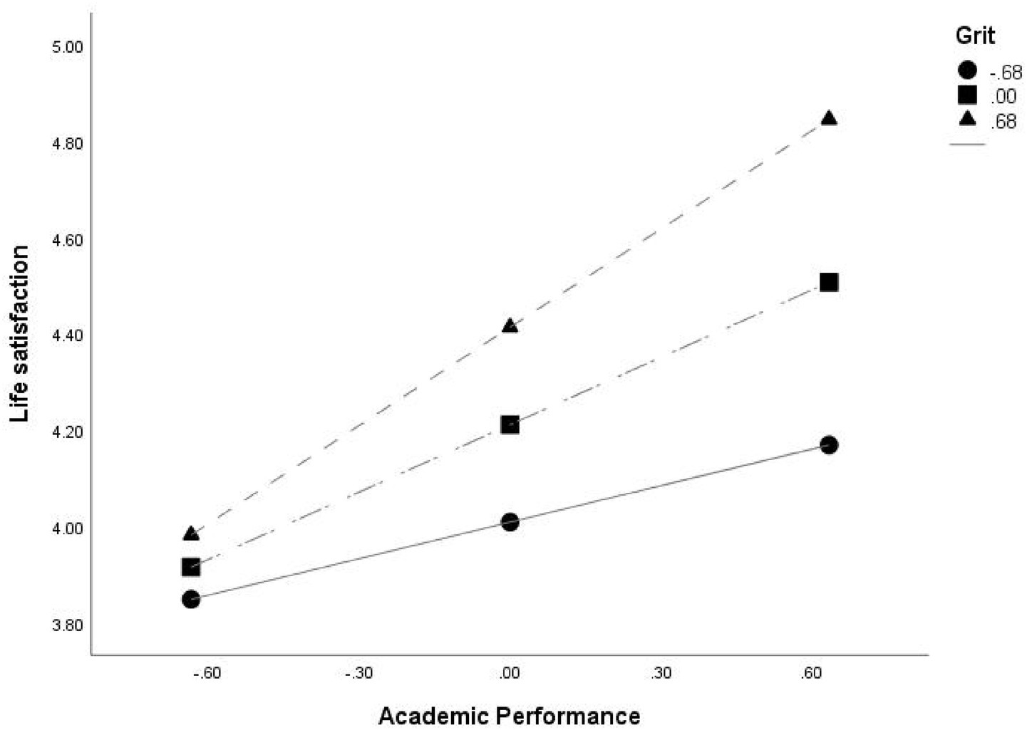 More specifically, the moderating effect of grit between AP and LS was also shown in Figure 3. When grit was not high, the slope of increasing LS as AP increased was relatively gentle, but when grit was higher, the slope of increasing LS as AP increased was relatively steep. In other words, as academic performance increased, life satisfaction also increased, but the rate of increase was greater among college students with higher level of grit.