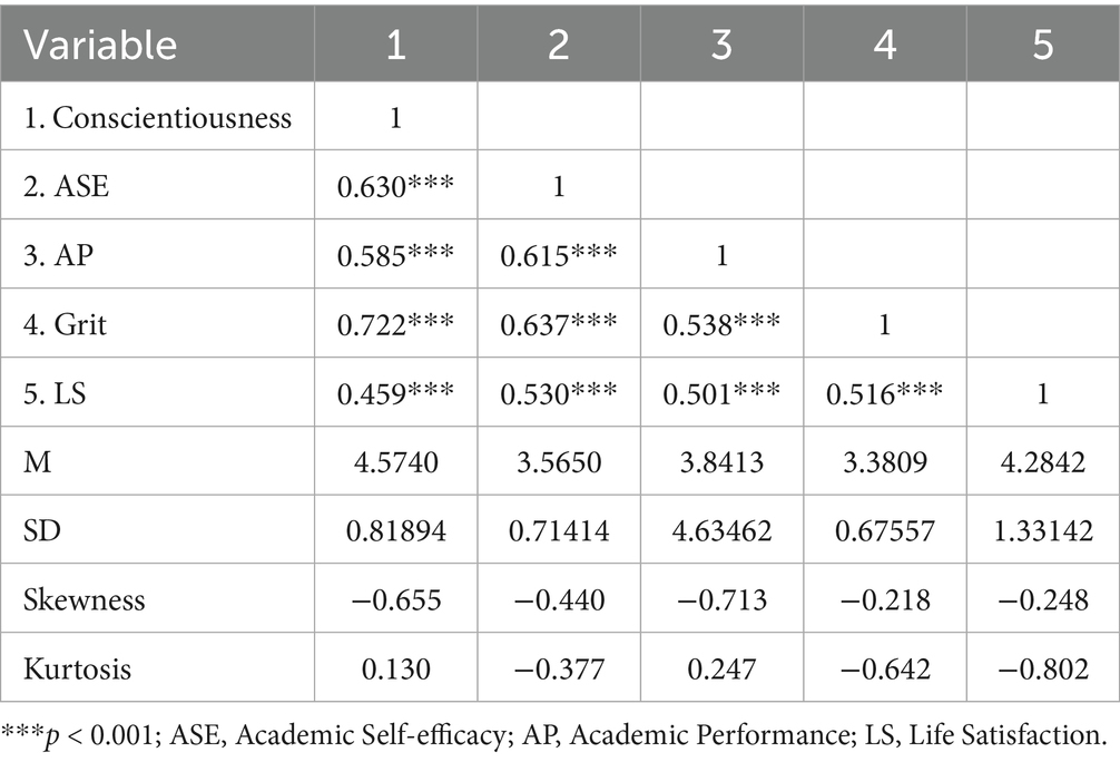The correlations within the main variables were presented in Table 1 through Pearson correlation analysis. Specifically, conscientiousness positively correlated with ASE (r = 0.630 p < 0.001), AP (r = 0.585, p < 0.001), grit (r = 0.722, p < 0.001) and LS (r = 0.459, p < 0.001). ASE positively correlated with AP (r = 0.615, p < 0.001), grit (r = 0.637, p < 0.001) and LS (r = 0.530, p < 0.001). AP positively correlated with grit (r = 0.538, p < 0.001) and LS (r = 0.501, p < 0.001). Grit positively correlated with LS (r = 0.516, p < 0.001). Notably, the correlation coefficient between conscientiousness and grit was larger than 0.7, suggesting multicollinearity problem. Accordingly, regression analysis was conducted to calculate the VIF and tolerance values, with LS as the dependent variable and grit as independent variables. The results showed that the tolerance value of the independent variable was 1, and the VIF value of the model was 1. According to Belsley (1980), a tolerance value below 0.10 or a VIF above 10 implies multi-collinearity, so there was no problem of multicollinearity for the current results. Furthermore, through frequency analysis, the value of conscientiousness averaged at 4.57 (range 1 to 6), ASE averaged at 3.57 (range 1 to 5), AP averaged at 3.84 (range 1 to 5), grit averaged at 3.38 (range 1 to 5), and LS averaged at 4.28 (range 1 to 7). Additionally, the skewness and kurtosis indices showed a normal distribution for all variables considered in the present study (values between −1 and 1) (Aluja et al., 2007).