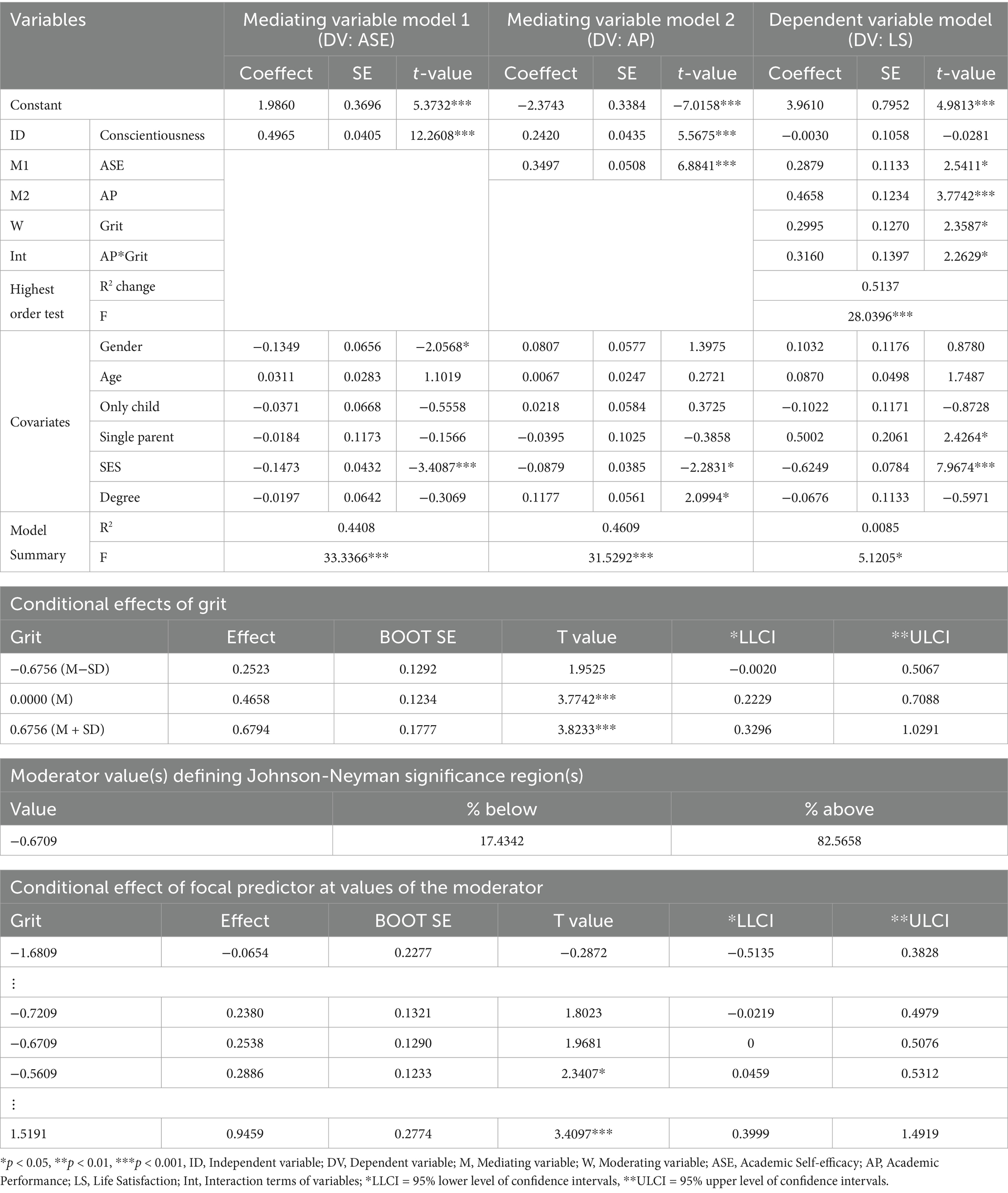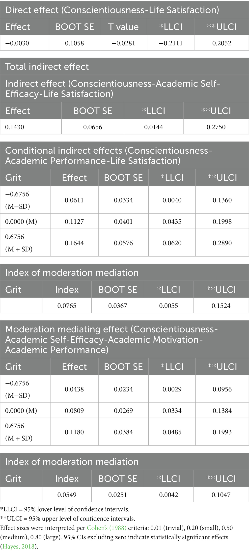Methods: This study aimed to clarify the moderated mediation mechanism linking conscientiousness, academic self-efficacy, academic performance, grit, and life satisfaction. To this end, an exploratory hypothetical model was proposed, and empirical verification of the model was conducted via a random sampling survey. The respondents of this study were 304 undergraduate and professional students from China. The data analysis tools used in this study included SPSS AMOS Version.26, SPSS Statistics Ver.25 and SPSS PROCESS Macro-Ver.4.2.