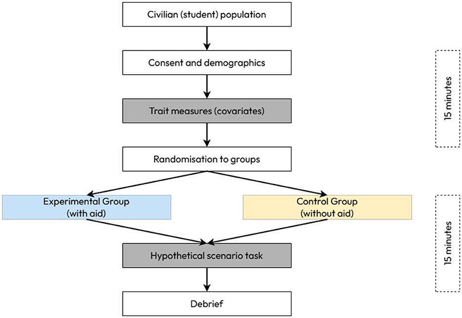 All participants completed a single, 30-min visit to the same laboratory at the lead author's institution (Figure 1). After providing their written informed consent, participants first completed a questionnaire pack (see “questionnaires”) to assess trait measures of cognitive flexibility, creativity, and imagination. After this, the researcher provided a brief explanation of the hypothetical task scenario that participants were to use as a guideline for creating deceptive stratagems (see “scenario” and Supplementary material 1). Participants were then asked to read through the document detailing the hypothetical task scenario without a time limit. For those allocated to the experimental group, the visual aid for military deception was provided. Participants were instructed to “please familiarize yourself with the content of this visual aid in any way you wish and please ask any questions to clarify any content if necessary.” Again, participants were not limited for time to look at the military visual aid and familiarize themselves with the strategic cues provided within.