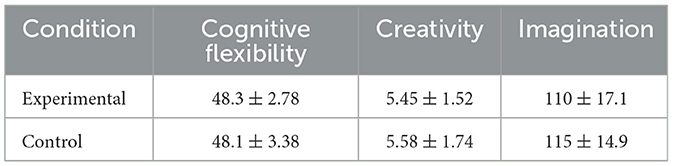 Perceived cognitive flexibility [t78 = 0.325, p = 0.746, d = 0.073, 95%CI (−0.366, 0.511) ], creativity (U = 752, p = 0.638, r = 0.061), and imagination [t78 = −1.241, p = 0.218, d = 0.278, 95%CI (−0.718, 0.167)] were not significantly different between the participants of each condition and all with trivial to small effect sizes. Table 1 provides mean ± SD of all participants' perceived cognitive flexibility, creativity, and imagination scores.
