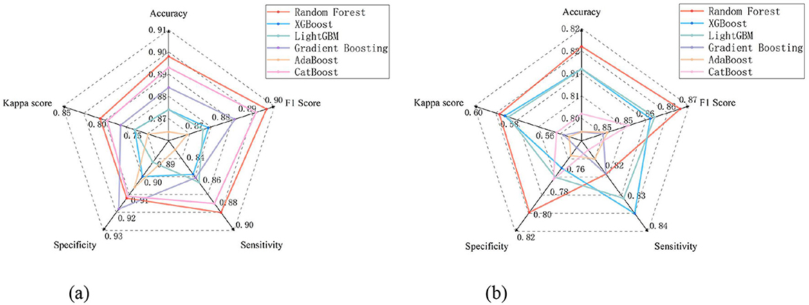 Figure 4. Radar Plots Comparing Model Performances for Children's and Adults'Safety Perception Modeling. (a) Modeling Data for Children (b) Modeling Data for Adults.