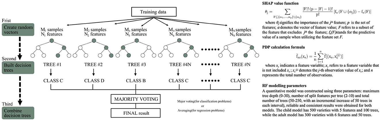 In addition, considering the specific need for model interpretability in environmental safety perception research, Shapley additive explanations (SHAP) values were introduced to analyze the marginal contribution of each environmental factor. This approach quantifies the differentiated impact of various street elements on children's and adults' safety perception and reveals the complex interaction effects between features (Iban, 2022; Wojtuch et al., 2021). Furthermore, Partial Dependence Plot (PDP) analysis was employed to visualize the functional relationship between individual environmental elements and perception scores while controlling for other variables. This method effectively distinguishes between linear and non-linear interaction patterns (Gao et al., 2023). The computational methods for SHAP and PDP are illustrated in Figure 5.