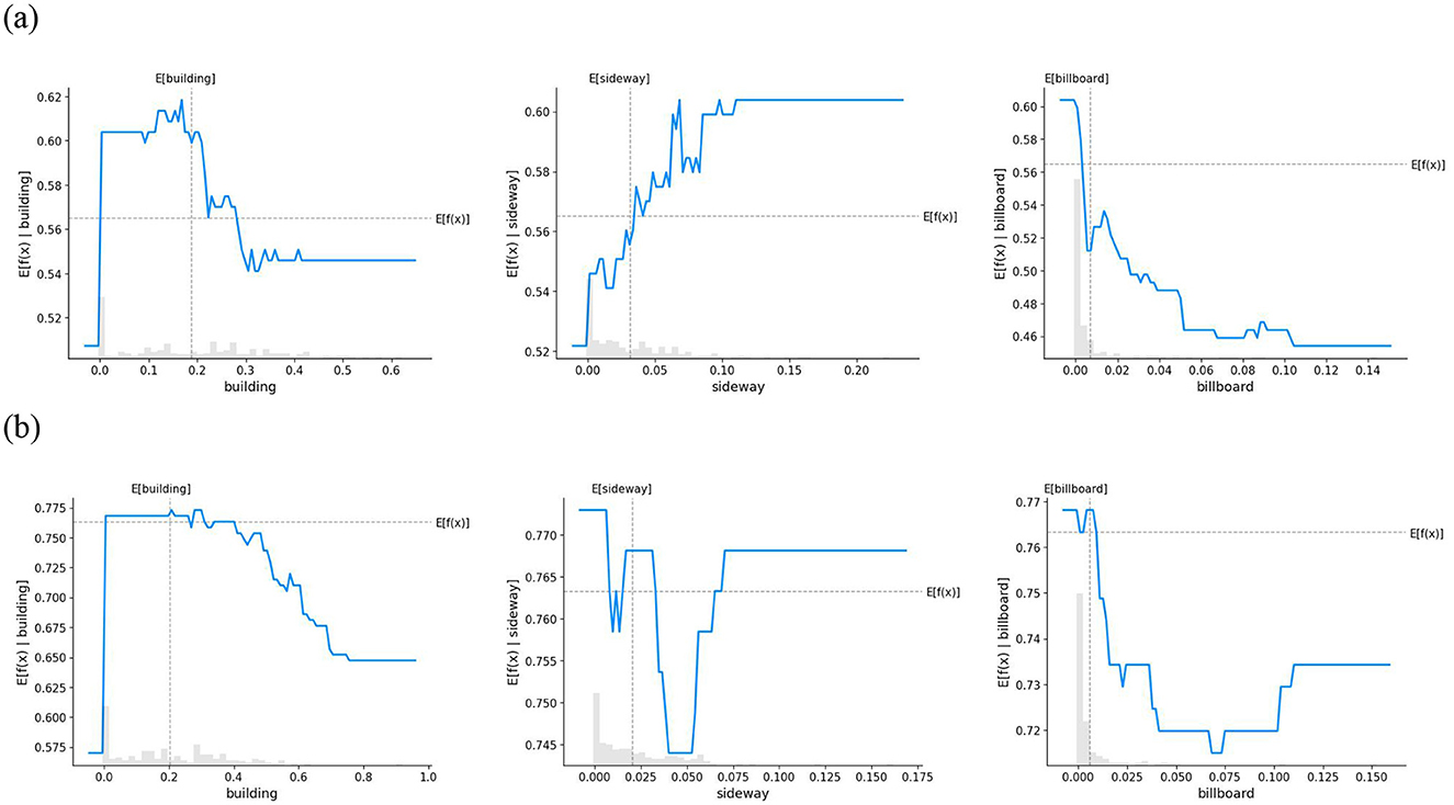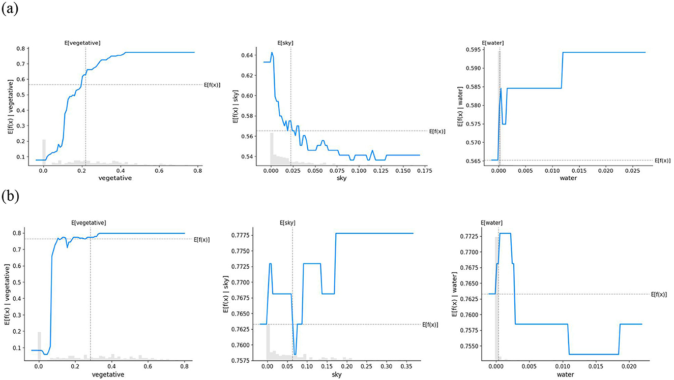 Figure 7. PDPs for the effect of natural elemental features on security perceptions. (a) Child (b) Adult.