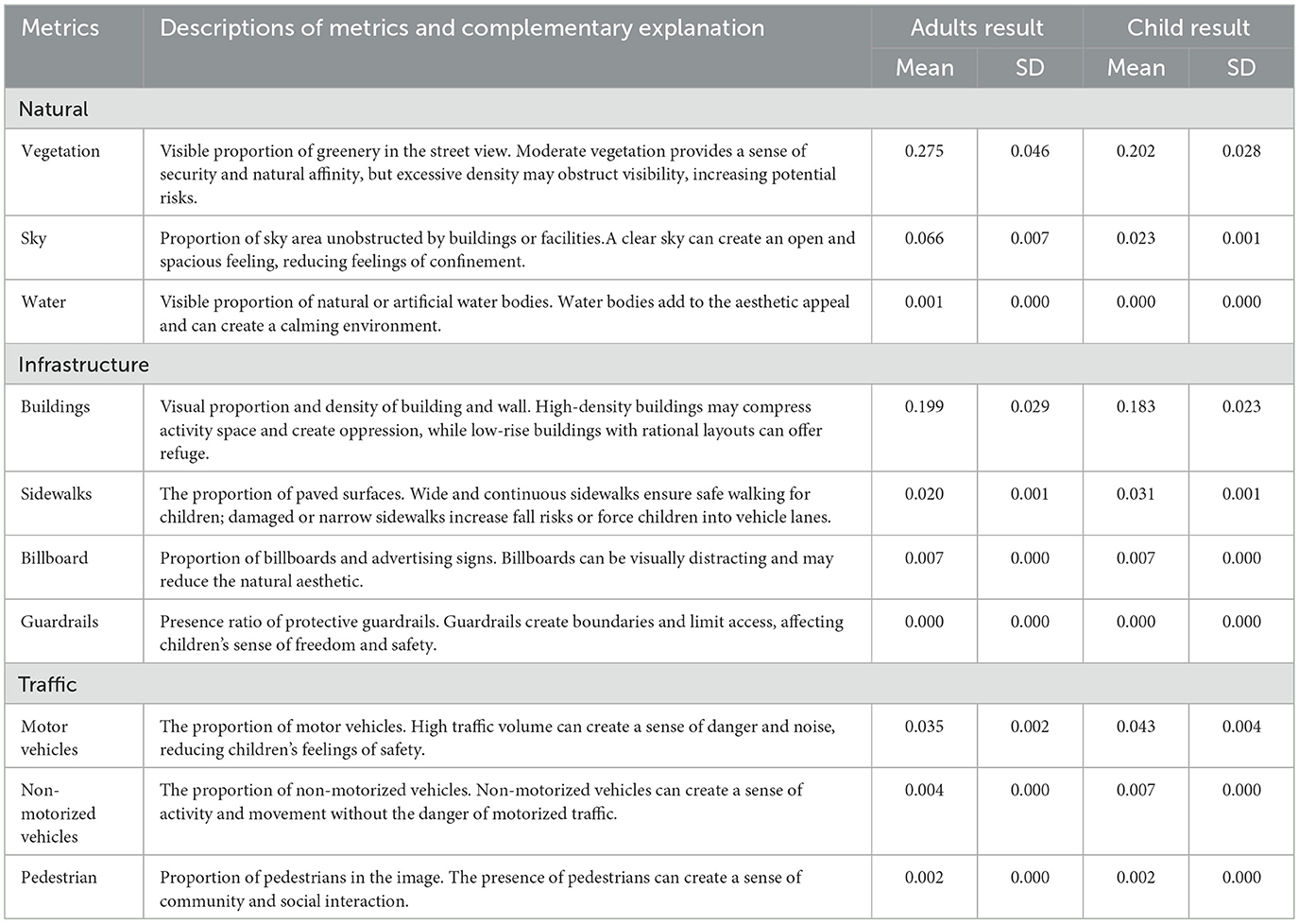 Finally, the collected SVIs were subjected to semantic segmentation, allowing for the precise calculation of the proportion of each environmental element within the images. Considering well-documented characteristics of children's cognition, such as their tendency for distractibility (Rueda et al., 2004), weaker ability to anticipate danger (Meyer et al., 2014), and behavioral patterns, including limited activity range (Fisher et al., 2015) and randomness in movement (Gong and He, 2016), the selection of evaluation variables prioritized those most likely to influence children's perception of safety. Specifically, 10 environmental elements were chosen, as shown in Table 1. The study further analyzed and explained the bidirectional relationship between these elements and safety perception.