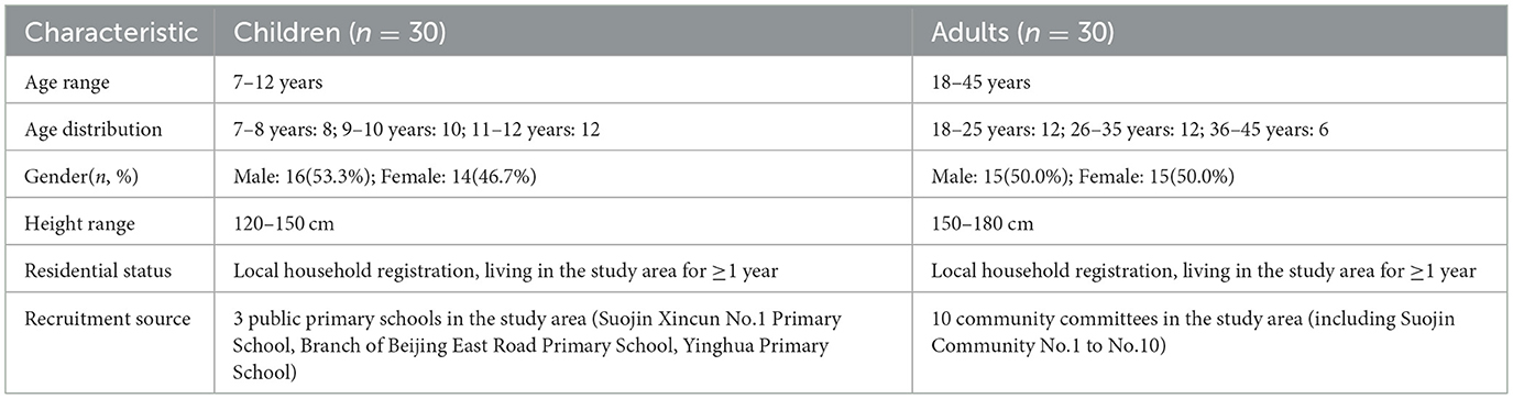 For the construction of the human-machine adversarial perception prediction model, this study adopted innovative research method “Photovoice” for children and adults. To ensure sample representativeness, participants were recruited via a “community collaboration with stratified sampling” strategy (demographic details in Table 2): thirty children from 3 local public primary schools, and 30 adults with the assistance of 10 community neighborhood committees. The Photovoice implementation involved: brief training for participants to clarify objectives (documenting “safe/dangerous” environments to reflect safety perception levels) and shooting rules; a 7-day independent image capture period covering all spatial types in the study area, with participants providing short explanations for their judgments; and independent screening by two researchers to exclude invalid samples. Ultimately, eight hundred and sixty seven valid safety perception photos from each group were obtained, which were used to build the safety perception labeling system for subsequent model training. This research strictly adheres to ethical guidelines. It involves no human experimentation, having obtained ethical approval from Nanjing Forestry University. For child participants, verbal informed consent was first acquired from the children themselves, and written informed consent was formally secured from their guardians, who signed the informed—consent forms. All findings are used solely for academic purposes, with no commercial utilization whatsoever. Moreover, as no facial information exists in the photos, data privacy is inherently protected through the absence of personally identifiable visual elements, further ensuring participants' information security.