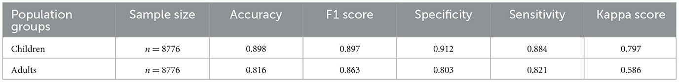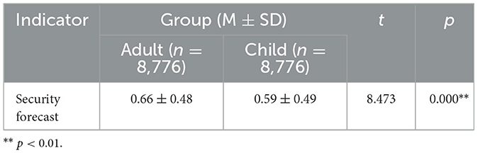 For model training, 70% of labeled safety perception images from adults and children were used, with 30% reserved for testing. The adult model achieved 80% test accuracy, showing effectiveness in capturing adult perceptions. The child model had 75% accuracy, which mainly reflects the greater individual differences in children's safety judgments—their perceptions are more influenced by personal experiences and preferences—while also confirming the effectiveness of the Photovoice method in capturing authentic child perceptions; overall, the model demonstrated strong predictive capabilities, laying a reliable foundation for subsequent analysis of children's environmental safety perception characteristics. The trained ResNet hybrid prediction model was applied to all sampled points within the study area to predict safety perception scores separately for children and adults based on their respective street-view images. An independent t-test was conducted to examine the statistical differences in safety perception between the two groups, as shown in Table 3. The results indicate a significant difference in safety perception between adults and children. To further identify high-risk areas and optimize resource allocation, the predicted perception scores were spatially visualized, and a safety perception score map was generated.