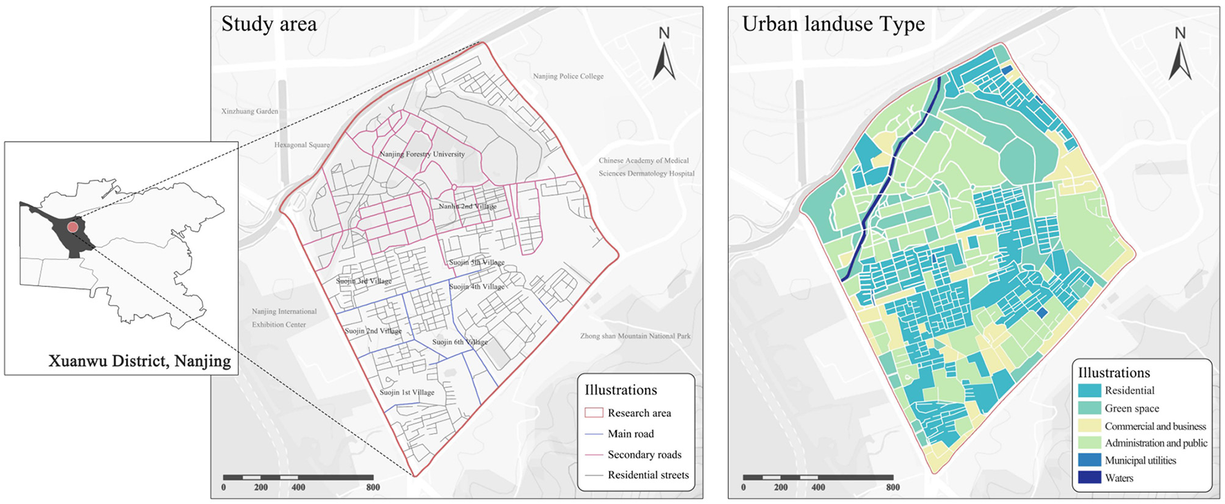 The study area is situated in the core of Suojin District, Xuanwu District, Nanjing, covering approximately 196.6 hectares. Spatially, it is centered around Nanjing Forestry University and Suojin Village, with clearly defined boundaries, as shown in Figure 1. As a designated national demonstration site for child-friendly community development, this district has a high concentration of primary education resources, including multiple high-quality schools. It also encompasses more than 10 residential communities and university-affiliated housing areas, forming a high-density child population cluster. However, the spatial environment of this area exhibits a complex and multi-layered structure, comprising static spaces such as university teaching areas and old residential complexes, while also being adjacent to major urban traffic arteries like Longpan Road and Xuanwu Avenue. These conditions contribute to fragmented public spaces and the interweaving of pedestrian and vehicular traffic flows, creating a complex urban environment (Yuxin, 2024), makes it a valuable case study for optimizing child-friendly urban spaces.