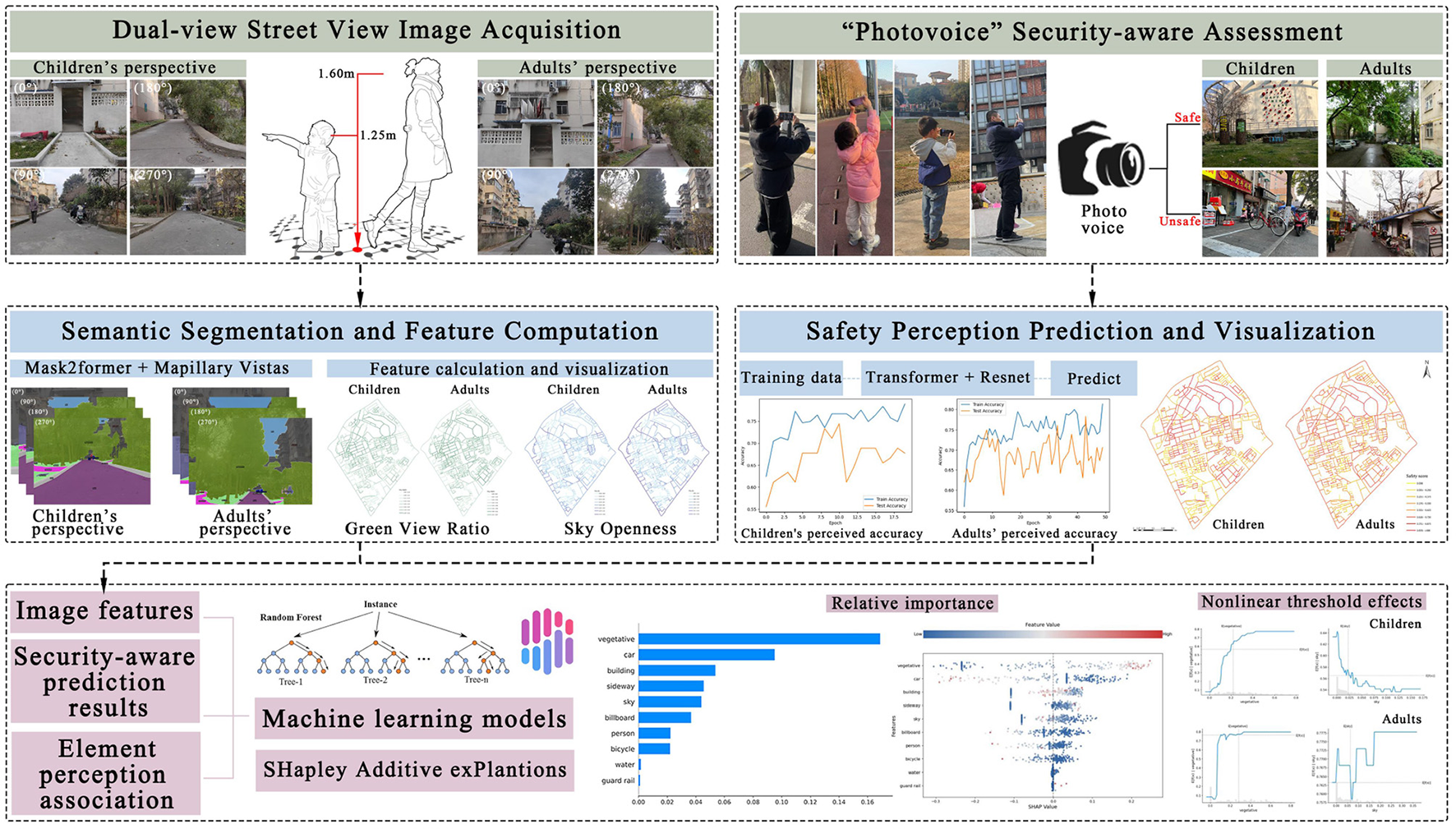 On the basis of this understanding, this study aims to integrate SVIs, deep learning, and the Photovoice method to comprehensively assess and synthesize children's psychological perception of environmental safety in urban streets from a child-friendly perspective. By exploring the differences in safety perception between children and adults, the study seeks to provide practical strategies for constructing child-friendly street environments. The research aims to address the following questions: (1) What are the primary factors influencing children's perception of street environmental safety, and what are their relative weights? (2) How do children's and adults' perspectives differ in their perception of environmental safety in urban spaces?