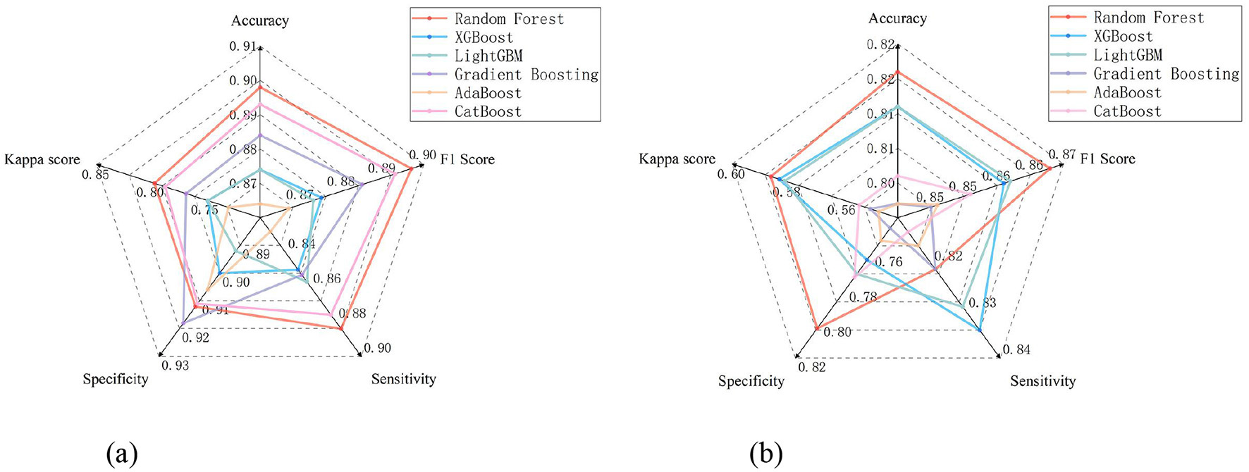Radar Plots Comparing Model Performances for Children's and Adults'Safety Perception Modeling. (a) Modeling Data for Children (b) Modeling Data for Adults.