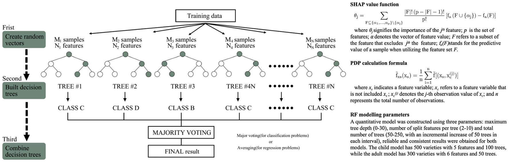 Random forest technique example and calculation methods of SHAP and PDP.