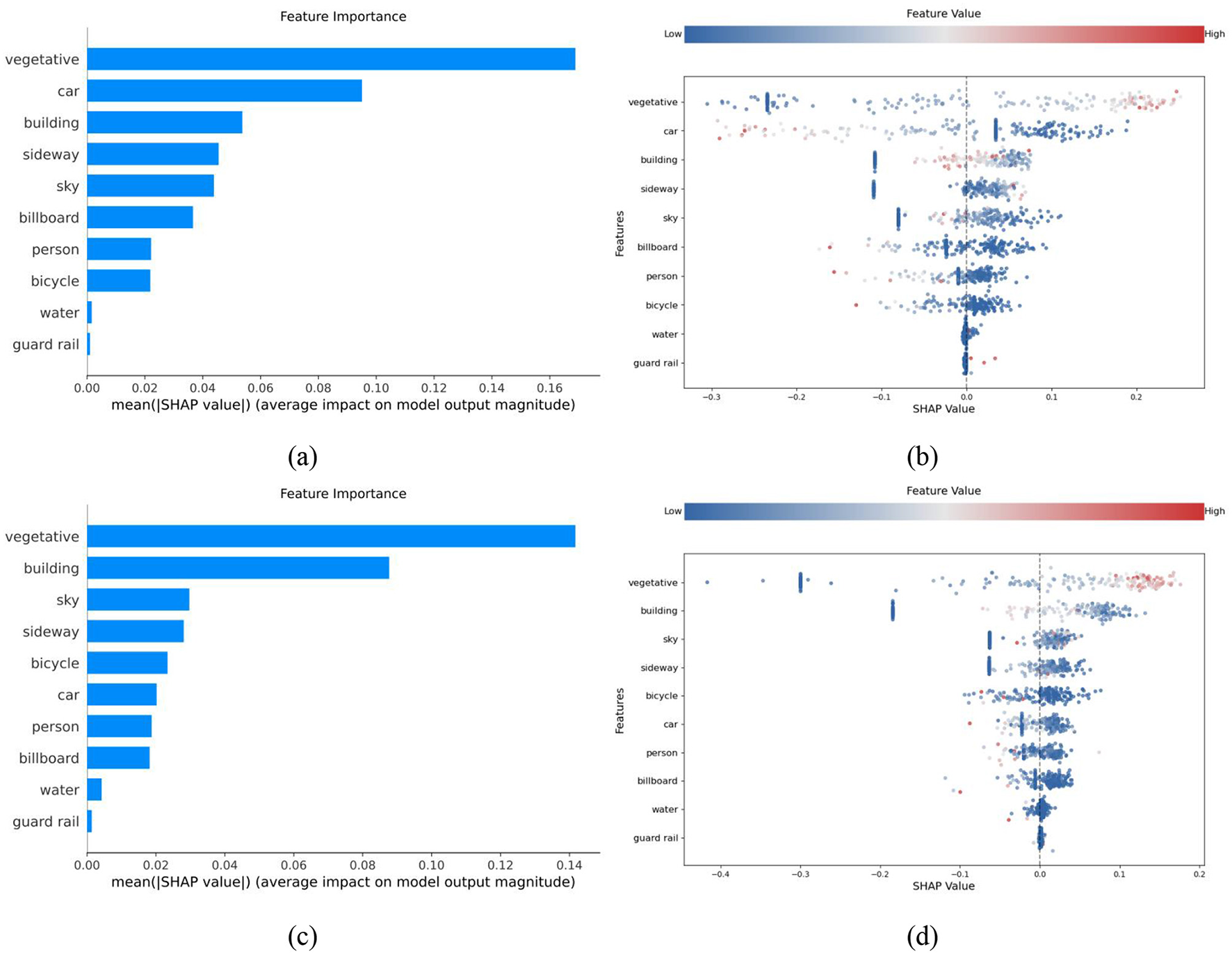 The results of the importance ranking and swarm plots indicate significant heterogeneity in the influence of different environmental factors on children's and adults' safety perception. As shown in Figure 6a, the five most influential factors on children's safety perception are vegetation, motor vehicles, buildings, sidewalks, and the sky. When this result is combined with the analysis in Figure 6b, children's safety perception is evidently highly affected by environmental elements, with vegetation, motor vehicles, and buildings having the greatest impact. By contrast, Figure 6c shows that the five factors with the highest impact on adult safety perception are vegetation, buildings, the sky, sidewalks, and bicycles. According to Figure 6d, only vegetation and buildings have a significant effect on adults' safety perception, while the influence of other factors is relatively minor. Overall, vegetation consistently exerts the most significant impact on children's and adults' safety perception models. However, the influence of motor vehicles, buildings, billboards, the sky, and bicycles differs significantly between the two groups. This discrepancy aligns with differences in environmental cognition between children and adults, reflecting their distinct perceptual needs and areas of focus in evaluating safety within the urban environment.