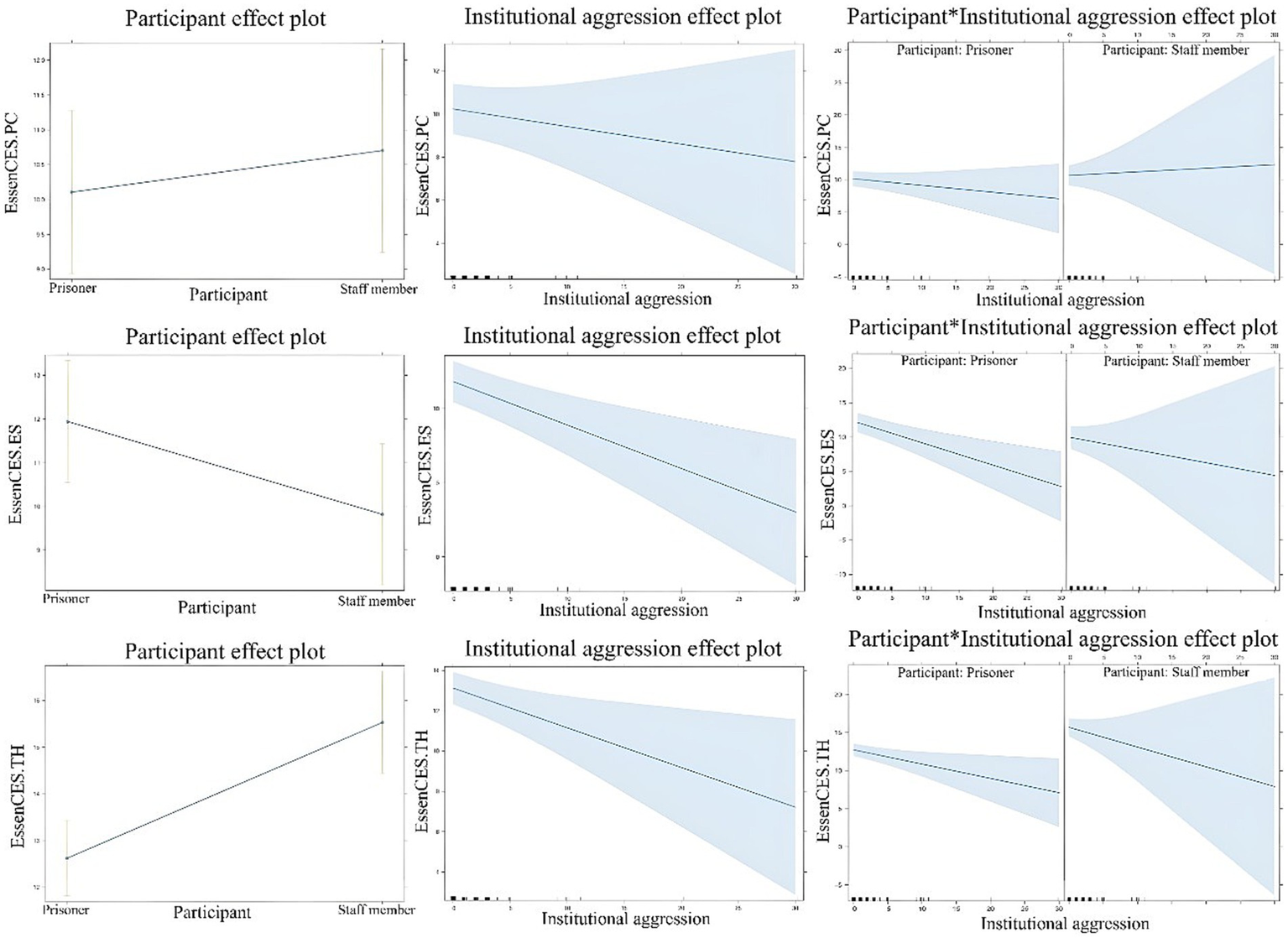 Multilevel modeling using linear mixed-effects models (LMMs) was performed using lme4 package from R (Bates et al., 2015). A series of LMMs was fitted to examine whether scores on EssenCES subscales (therapeutic hold, experienced safety, and patients’ cohesion) vary as a function of institutional aggression, security level, occupational position (staff member or resident), and their interactions. Two sets of models were specified for each EssenCES subscale. The first estimated institutional aggression, occupational position (staff member vs. resident), and their interaction as fixed effects. In the second one, we replaced institutional aggression with security level, retaining occupational position and its interaction with security level as fixed effects. All models also included a random intercept for estate to account for the nesting of responses within institutions. We used the institution (estate) as the cluster variable to account for the variance in responses arising from participants being nested within the same facility. This approach statistically controls for shared environmental, procedural, and organizational factors within each institution that could systematically influence EssenCES subscale ratings, beyond individual-level predictors. Although all institutions operate under the same national regulations and policies, each facility develops its own operational procedures and organizational culture. These facility-specific characteristics and practices, such as staff–inmate interaction styles or the overall organizational climate, can exert a systematic influence on participants’ perceptions and experiences, including their ratings on the EssenCES subscales. Marginal and conditional R2 values were reported to reflect the variance explained by fixed effects and the whole model. lmerTest package (Kuznetsova et al., 2017) was employed to compute p-values for mixed models, and the sjPlot package (Lüdecke, 2024) from R was employed to create tables of model results. ggplot2 (Wickham, 2016) and effects (Fox and Weisberg, 2019) packages from R were used for data visualization.