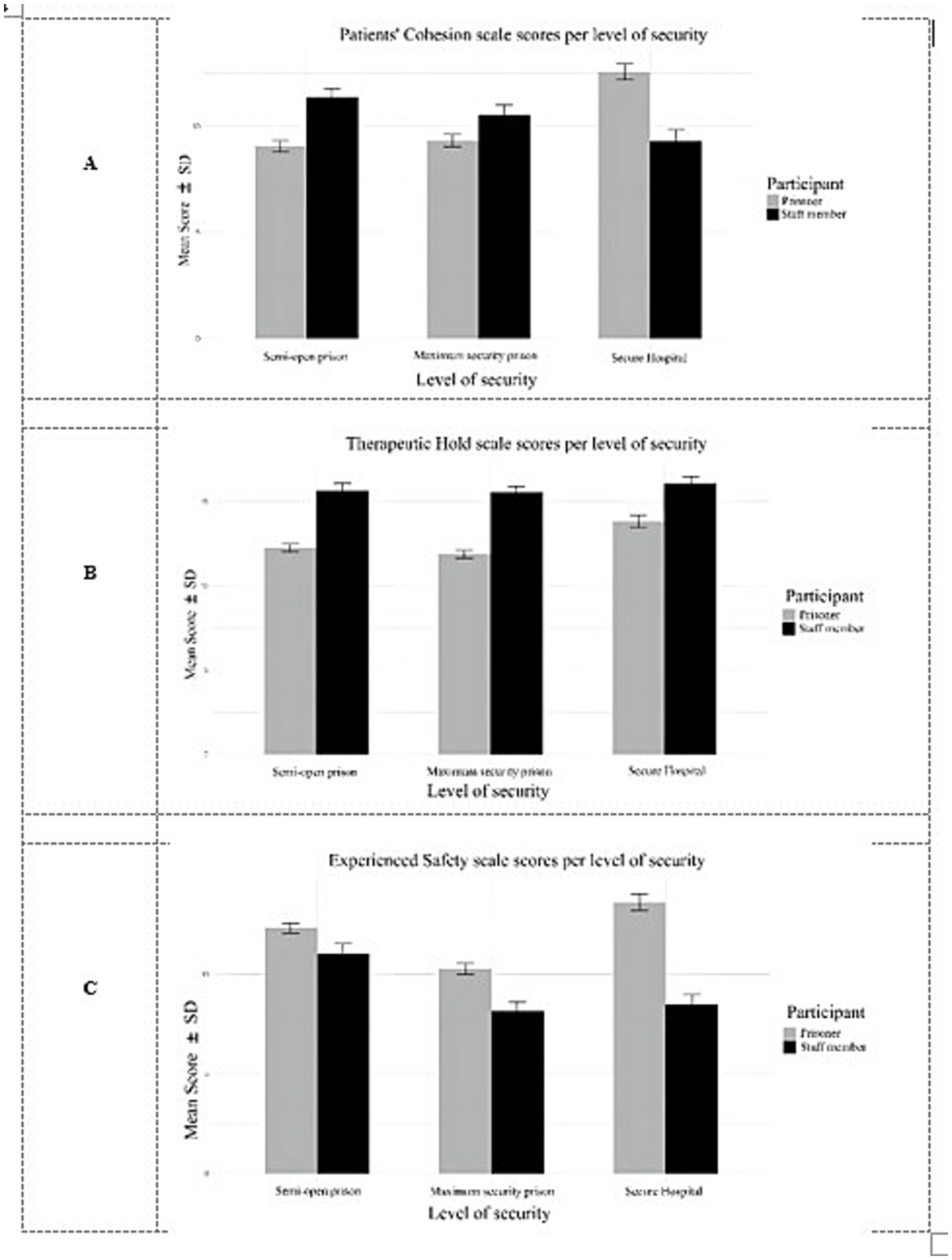 The Romanian version of EssenCES with the three scales Patients’/Inmates’ Cohesion and Mutual Support, Experienced Safety and Therapeutic Hold showed good psychometric properties for prisons and forensic hospitals. Inmates and staff rated the prison climate slightly differently, with staff having a more positive view of therapeutic support than inmates, and inmates having a more positive view of the security on the ward. Staff in semi-open and maximum security regimes reported higher Patient Cohesion scores than inmates in regular prisons, while staff in forensic hospitals reported lower Patient Cohesion scores than inmates in the same settings.