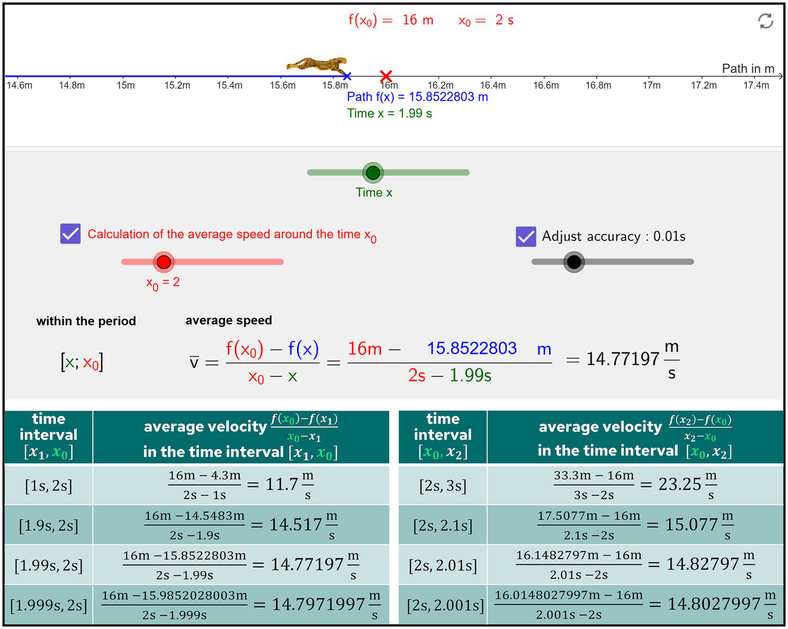 The basic mental model of derivative as local rate of change (RC) can be worked out using the example of a running cheetah for which the speed at a certain point in time is to be determined. The current location of the cheetah can be determined at any time using suitable measuring devices (e.g., from a GeoGebra-based simulation, see Figure 2). The average velocity in the time interval [2s, 3s] is calculated with the difference quotient . If you want to know the current speed at a certain time (e.g., ), you can reduce the time interval in which you examine the average speed further and further (Figure 2). The smaller the interval [x, x0], i.e., the closer x approaches , the closer the mean velocity comes the instantaneous velocity. It comes arbitrarily close. The value that is approximated is called the local rate of change. With this procedure, it is possible to intuitively understand the limiting process from difference quotient to differential quotient .