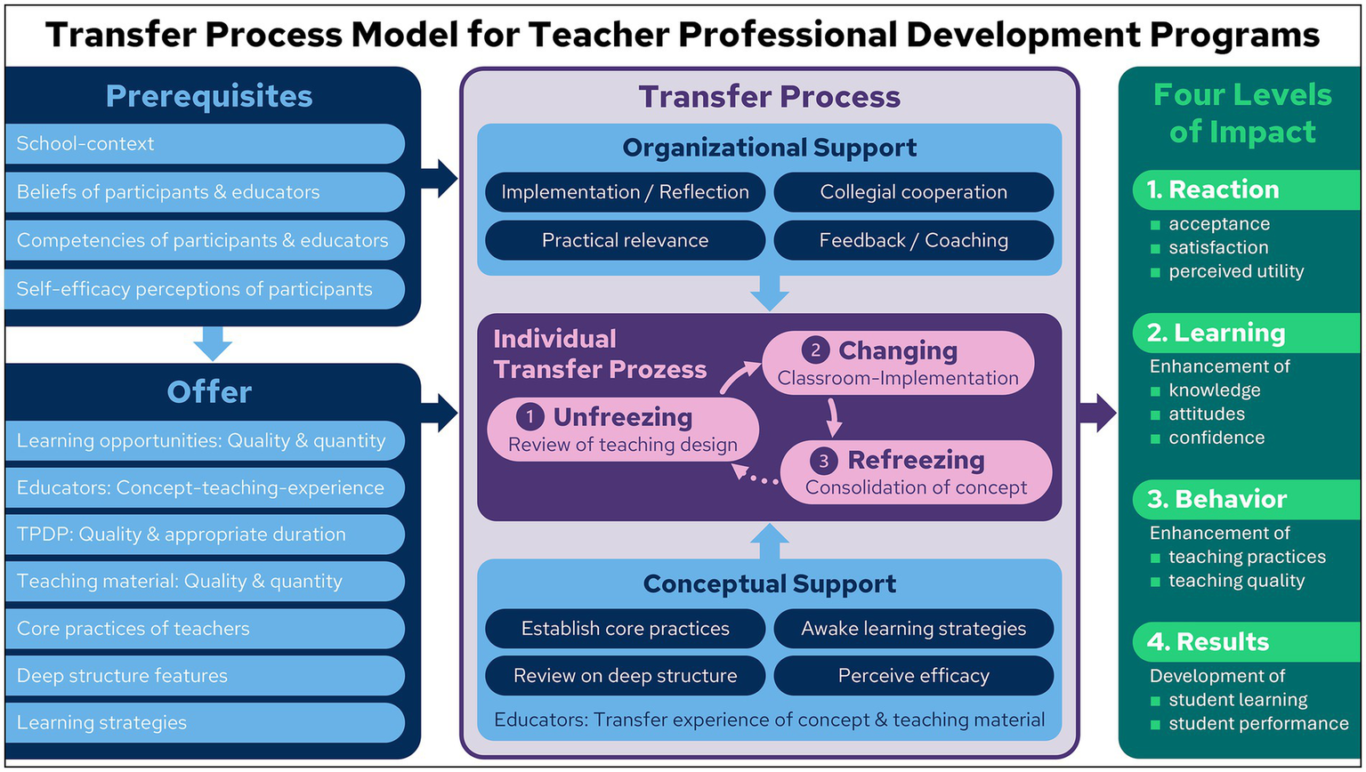 The transfer process, which is organized within the context of TPDP, can result in impact at four distinct levels. These levels of impact are consistent with Kirkpatrick’s four levels of training evaluation (Kirkpatrick and Kirkpatrick, 2016) which can be interpreted as attainable outcomes. In the following segments, we delineate and substantiate them for the TPDP transfer process model (see Figure 3) in accordance with the perception of these levels by Lipowsky and Rzejak (2015, 2019).