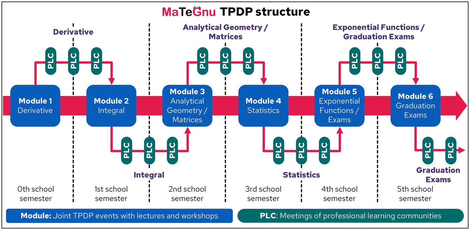 The project MaTeGnu is a comprehensive TPDP for all schools with upper secondary levels in the German state of Rhineland-Palatinate. This initiative is a collaborative effort between the Ministry of Education of Rhineland-Palatinate and the Chair of Mathematics Education for Secondary Schools at the RPTU University of Kaiserslautern-Landau. The latter is responsible for (1) designing the program and its organizational structure, (2) developing concepts and content based on current research findings in mathematics education, and (3) providing substantive input for TPDPs. This ensures that MaTeGnu is based on research on teaching and learning mathematics (Loucks-Horsley et al., 2010; Taylor et al., 2017; van Veen et al., 2012) and, on the other hand, that scientific experts are leading the development and design of the program (Timperley et al., 2007), two proven essential criteria for successful TPDP. The program endeavors to remediate the identified issues in upper secondary mathematics education by prioritizing the cultivation of conceptual understanding with basic mental models and leveraging technology-enhanced teaching. MaTeGnu is meticulously developed in terms of content and structure to address the prevalent challenges associated with TPDP, implementing the proposed TPDP transfer process model.