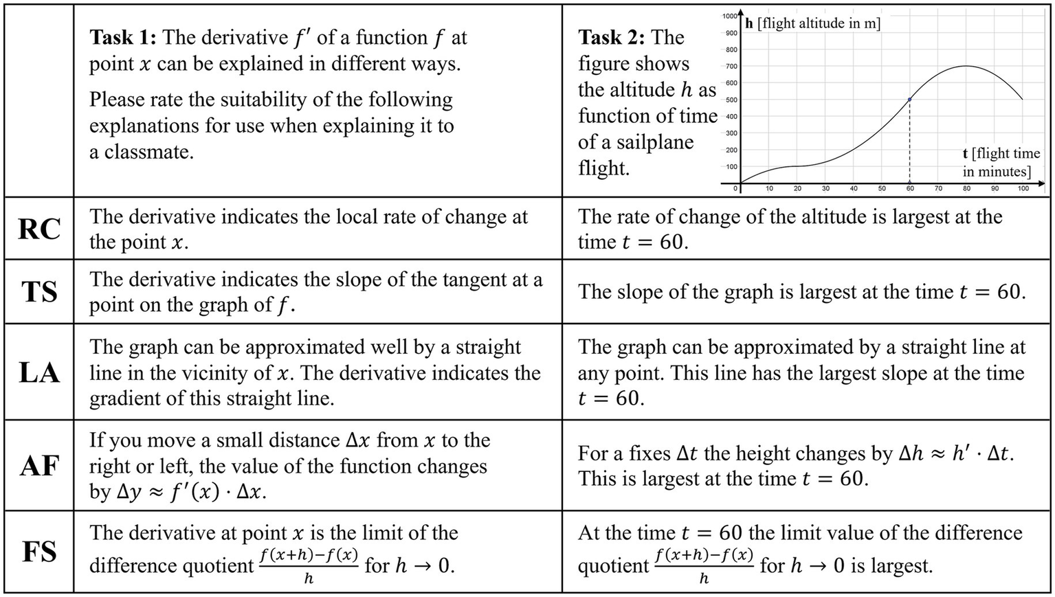 Rolfes et al. (2021) present an inventory of the findings of school performance studies with survey dates from 1995 onwards, that recorded the mathematics performance of upper secondary school students in Germany. The investigation revealed that the majority of students exhibited evident deficiencies in scientific propaedeutics. Specifically, their capabilities were found to be limited in their ability to engage with learning content typically encountered at the upper secondary level, such as analysis and analytical geometry, among others. The primary objective of the tests utilized in the school performance studies was to evaluate conceptual understanding rather than the application of procedural skills. The activation and utilization of basic mental models (see Chapter 2.3) are imperative for the successful completion of numerous tasks. To solve the sample task illustrated in Figure 1, it is necessary to employ the basic mental model derivative as tangent slope (see Chapter 2.4) (Greefrath et al., 2016).