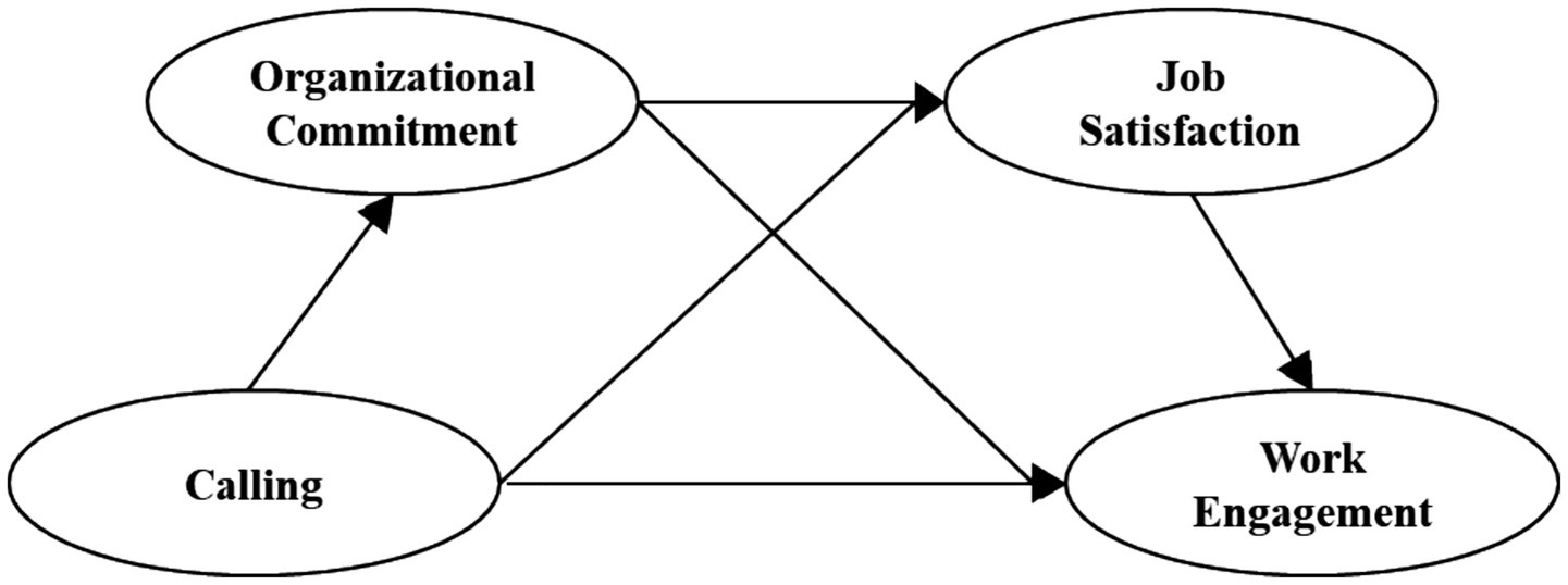 Hypothesis (H4): Organizational commitment and job satisfaction play a chain mediating role between calling and work engagement of ideological and political theory teachers in colleges and universities.