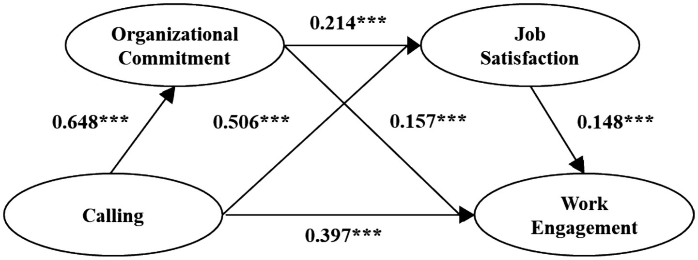 The results of the model operation (standardized coefficient) are shown in Figure 2. The calling can significantly positively predict organizational commitment (β = 0.648, p < 0.001). Calling and organizational commitment could significantly and positively predict job satisfaction (β = 0.506, p < 0.001; β = 0.214, p < 0.001); calling, organizational commitment and job satisfaction all had a significant positive impact on work engagement (β = 0.397, p < 0.001; β = 0.157, p < 0.001; β = 0.148, p < 0.001).