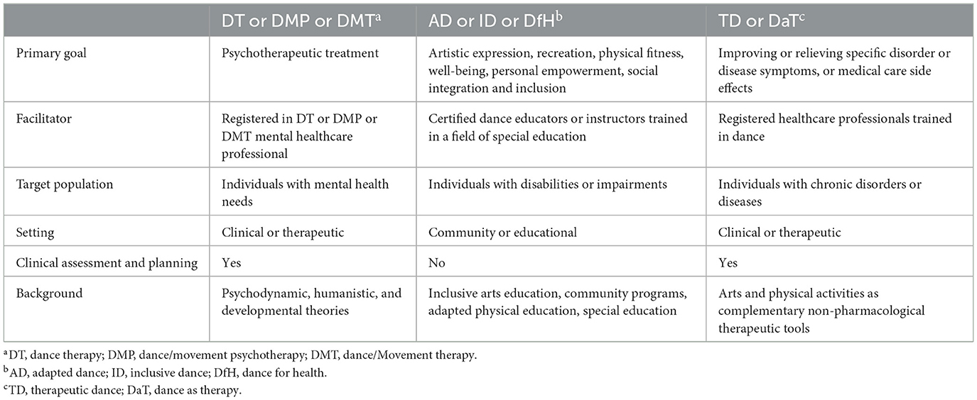 The question that arises is what practical recommendations could be derived from the above clarified definitions. As noted above, while content matters, context plays the principal role in the case of dance interventions for clinical populations. Each dance intervention may have a psychotherapeutic purpose, a complementary therapeutic purpose targeting specific disease or disorder symptoms, or a non-therapeutic purpose. Accordingly, the primary aim and the facilitator's professional background determine the category to which a given dance intervention belongs. Thus, content seems to serve context and not vice versa. We recommend the use of the terms DT or DMP or DMT in the case of a mental health care professional registered in DT or DMP or DMT and in the context of a primary psychotherapeutic goal. Instead, we recommend the use of the terms AD or ID or DfH in the case of a certified dance educator or instructor with a further training in a field of special education and in the context of a primary goal of artistic expression, recreation, physical fitness, well-being, personal empowerment, or social integration and inclusion. Finally, we recommend the use of the terms TD or DaT in the case of a registered healthcare practitioner with additional training in dance in the context of facilitating a dance intervention with a primary goal of improving or relieving specific disorder or disease symptoms, or medical care side effects.