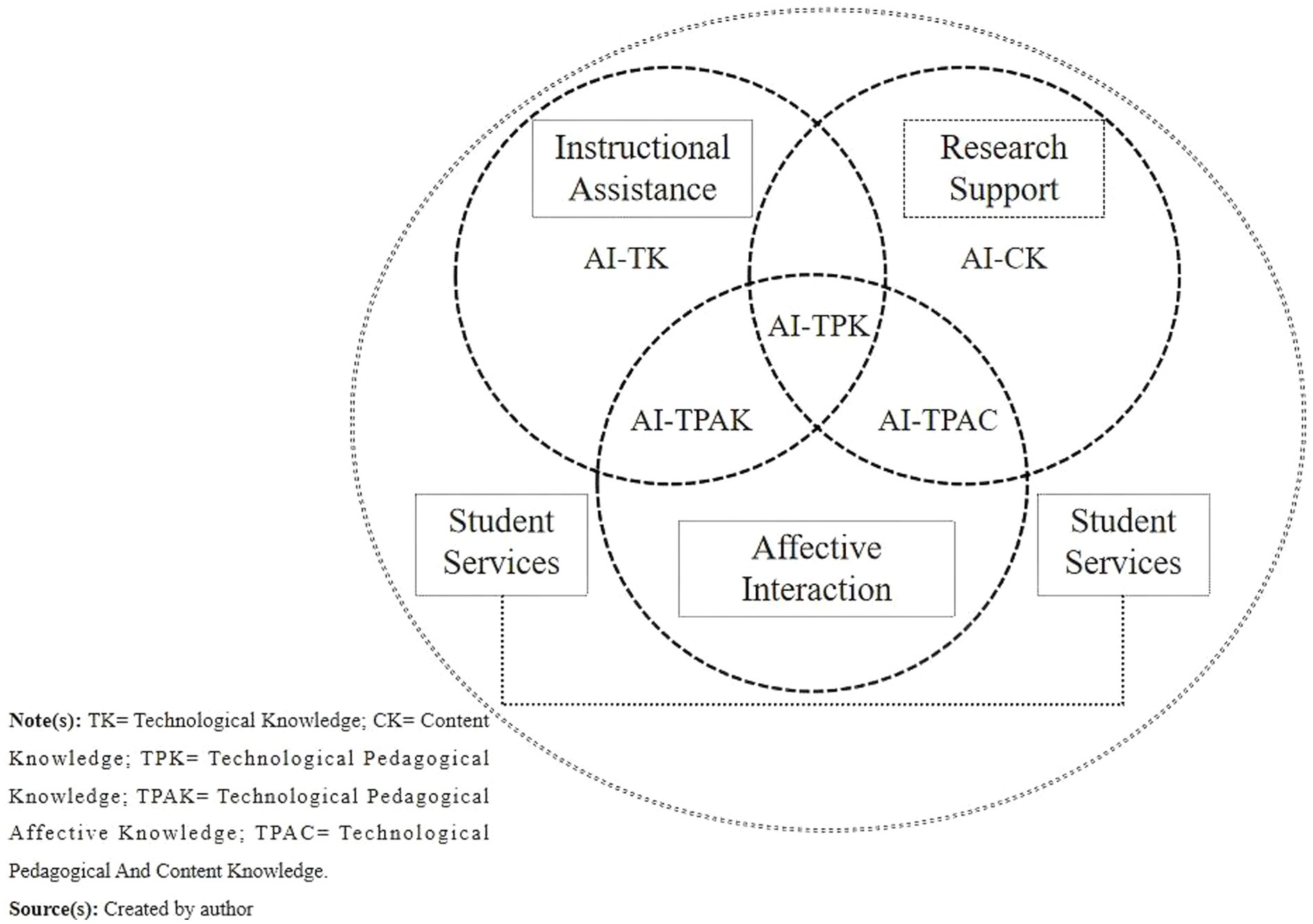 In higher education, faculty members serve as primary users of AI technologies in both teaching and research. Their AI literacy often manifests in complex, multidimensional ways (Laupichler et al., 2022). Drawing from prior literature and observed academic practices, faculty typically apply AI tools across four core domains: instructional assistance, research support, student services, and affective interaction (Yu, 2024; Zawacki-Richter et al., 2019). Their interactions with AI systems can be characterized through several common mechanisms (Şimşek, 2025; Kim, 2024), including: Information input–feedback, such as generating lesson content; Conflict resolution–trust building, for reconciling discrepancies between human and AI suggestions; Task delegation–cognitive offloading, involving the automation of repetitive or routine tasks; Decision support–human–machine collaboration, where AI contributes to complex academic analyses. These interaction patterns help operationalize how AI literacy manifests in faculty members’ daily practices. As illustrated in Figure 1, AI literacy is distributed across intersecting domains of technological (TK), content (CK), and pedagogical (PK) knowledge, giving rise to integrated competencies such as AI-TPK, AI-TPAC, and AI-TPAK. This framework highlights the dynamic and interdisciplinary nature of AI literacy in higher education (see Figure 1).