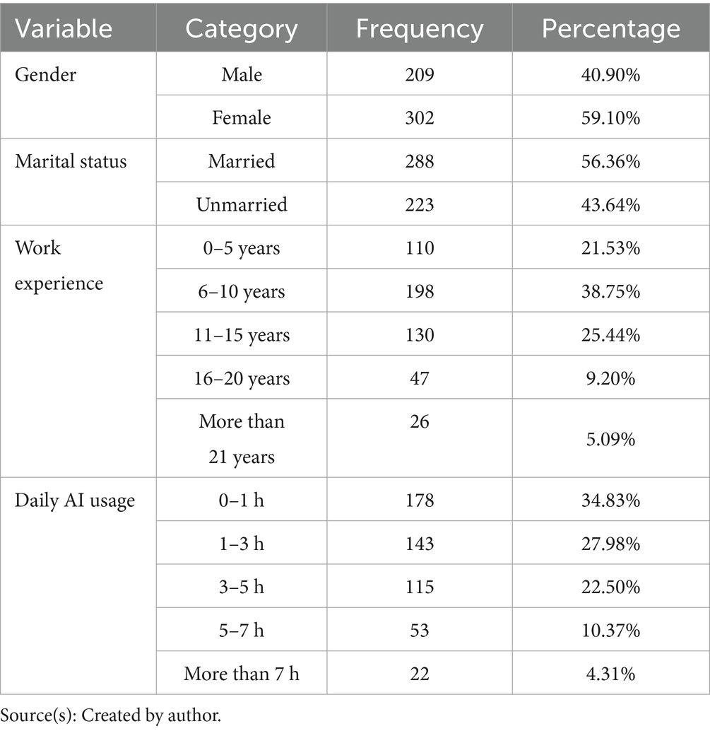 Data for this study were collected via an online questionnaire administered through Wenjuanxing1, a commonly used platform in China. The instrument employed a seven-point Likert scale and was distributed using a stratified random sampling strategy. Participants were recruited through the platform’s representative sampling service, ensuring diverse and demographically balanced responses. All surveys were completed electronically. To incentivize participation, respondents who submitted valid questionnaires received a monetary reward of 5 RMB. To ensure data quality and participant relevance, the study implemented multiple inclusion and exclusion criteria. (1) Screening Questions: At the beginning of the questionnaire, two mandatory screening items were included to confirm eligibility: (a) “What is your current occupation?”—only respondents selecting “university faculty member” were included; and (b) “Do you have basic experience using AI tools?”—only those responding “Yes” proceeded to the main section. Failure to meet either criterion led to immediate exclusion. (2) Attention Check: A directed-response item was embedded mid-questionnaire (e.g., “To confirm you are paying attention, please select ‘Strongly disagree’ for this item.”). Participants who failed to respond as instructed were excluded from the final dataset. (3) Responses exhibiting identical selections across all Likert-scale items were flagged for satisficing behavior or inattentive responding and subsequently removed from the analysis. In total, 543 questionnaires were received. After removing 32 invalid responses based on the criteria above, 511 valid responses remained, resulting in an effective response rate of 94.11%. A summary of participant demographic characteristics is presented in Table 2.