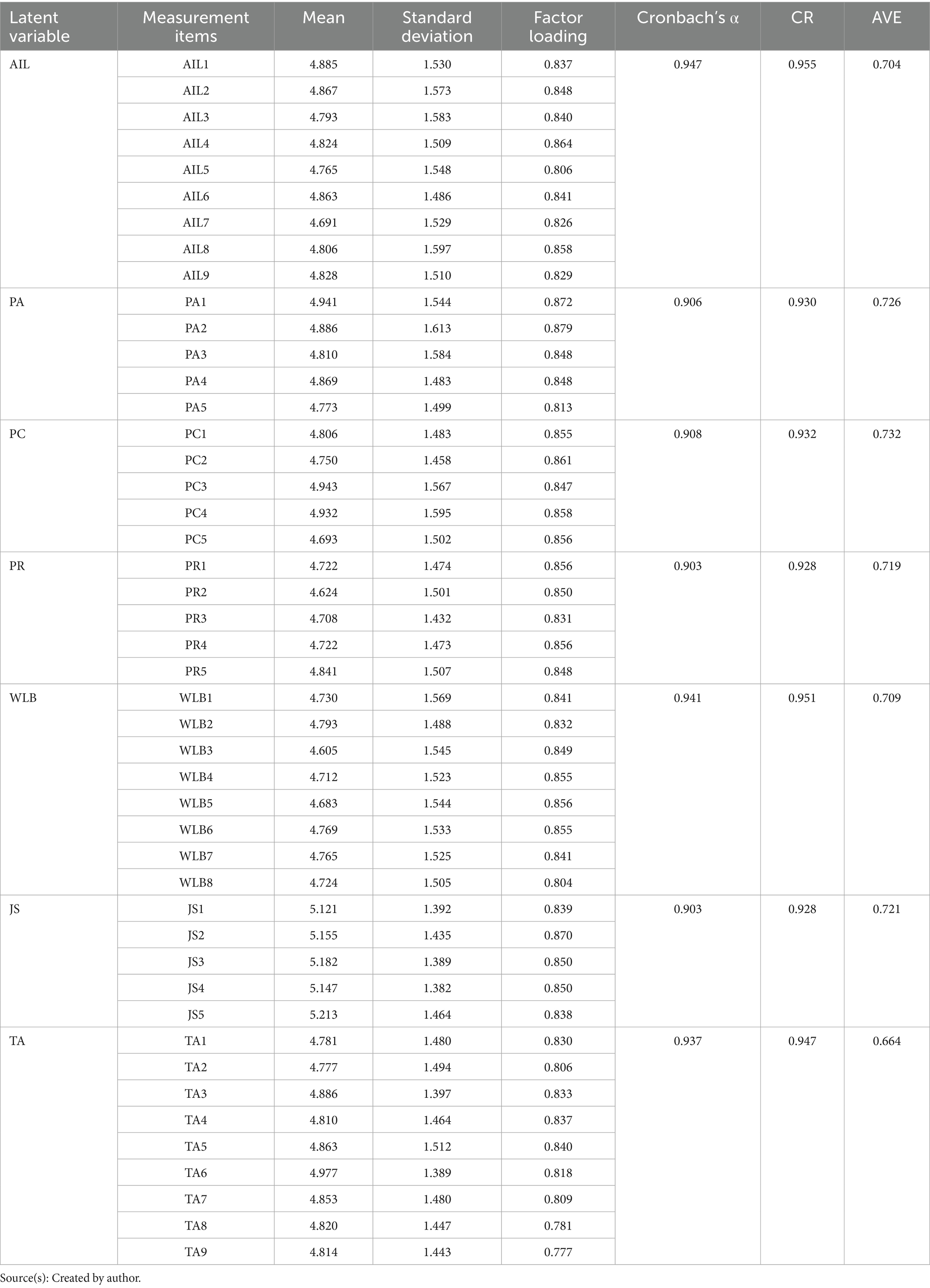 Measurement instruments in this research were derived from established scales with prior empirical validation across domestic and international studies (Haw et al., 2024; Lin et al., 2025; Mulyani et al., 2021; Wang et al., 2023; Yildirim et al., 2024). All scales were appropriately modified to align with the specific context of university faculty. The core variables measured in this study included AI literacy (AIL), perceived autonomy (PA), perceived competence (PC), perceived relatedness (PR), work–life balance (WLB), job satisfaction (JS), and technology acceptance (TA). Detailed information regarding the measurement dimensions, sample items, and sources of each scale is provided in Appendix 1.