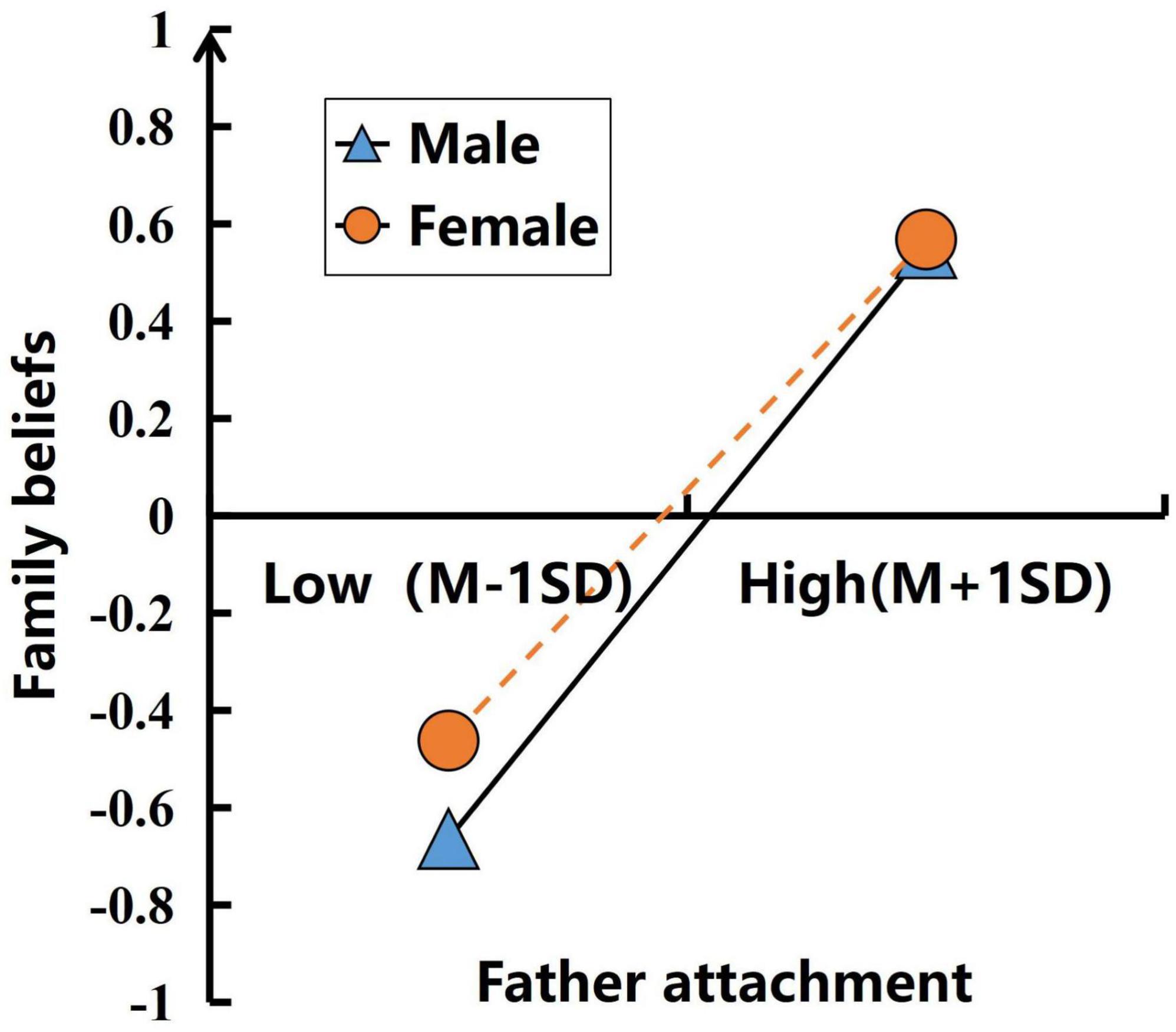 In the first stage of mediation, father attachment of both boys and girls significantly predicted family beliefs in a positive way, but father attachment of boys had a stronger promoting effect on fertility intention than that of girls. This may stem from differences in gender role socialization– Traditional perceptions portray men as dominant figures in family and society, representing authority and strength. As primary family leaders, decision-makers, and responsible parties (Amato and Cheadle, 2005; Xu and Feng, 2025, China), men are better equipped to handle pressures and challenges. Consequently, sons (men) tend to learn “family responsibilities and future planning” from their fathers, with paternal emotional support more readily translating into confidence in “family coping abilities.” In contrast, women’s construction of family beliefs is more influenced by maternal, peer, or romantic partner roles, making the impact of father attachment relatively weaker. This phenomenon may reflect the current lack of paternal involvement in family education.