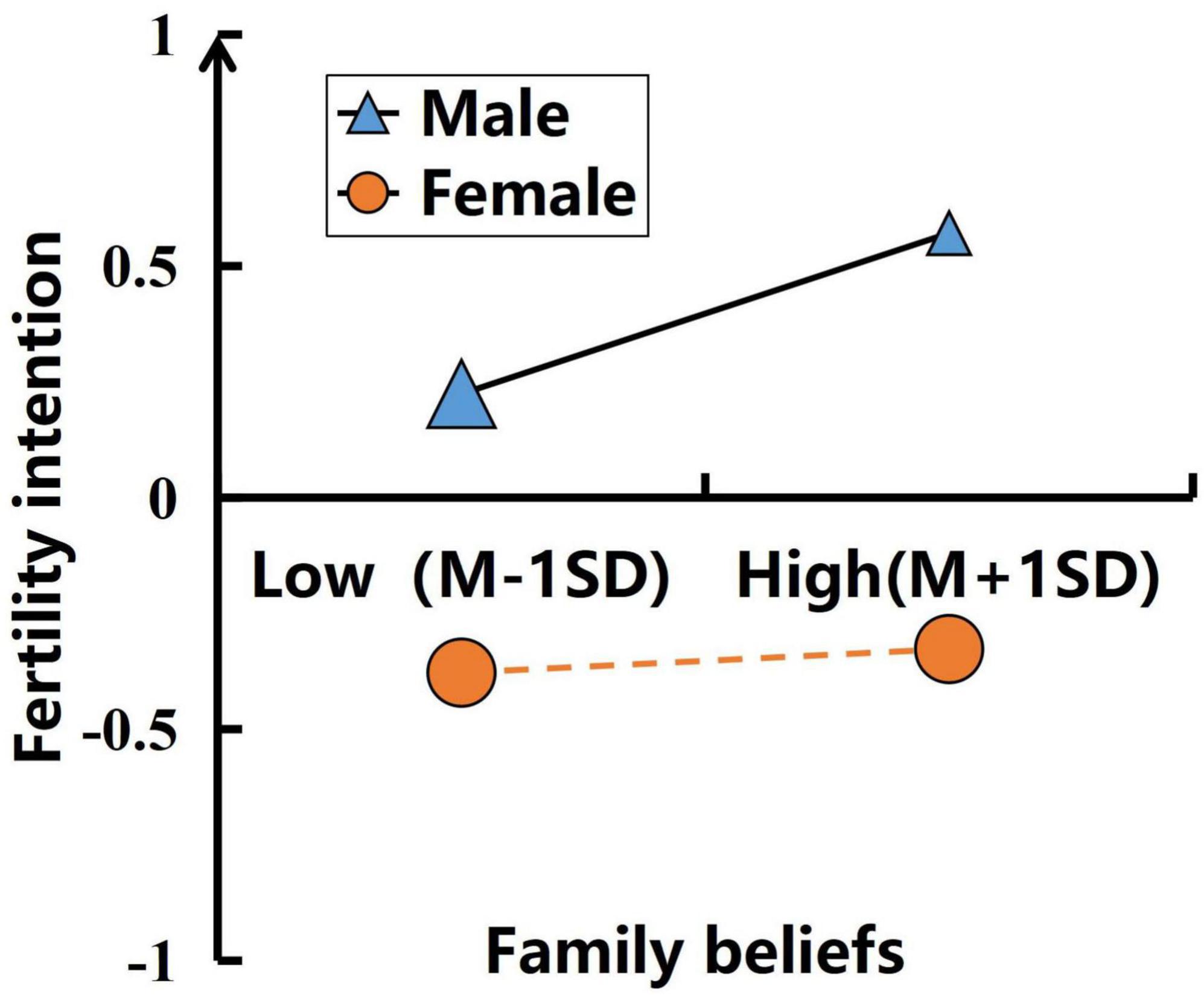 In the second stage of mediation, family beliefs were a significant predictor of fertility intention only in the male group, but not in the female group. From a cultural perspective, influenced by the traditional Chinese patriarchal family system (Shi and Zheng, 2023, China), men are seen as the economic pillars and authoritative figures of the family. After marriage, more women choose to live with their husband’s family, so men’s perceived and actual family beliefs (interpretation of difficulties and positive outlook) more deeply influence the fertility decisions of the giver, while the family beliefs of women’s original families have little impact on their future fertility intentions. Additionally, influenced by the traditional Chinese gender role division of “men work outside, women work inside,” since men are the main economic providers, they participate less in childcare and household chores, which naturally fall to women. This allows men to focus more on career development and personal self-realization, while women cannot focus on their careers and face conflicts between work and childbirth (Shi and Zheng, 2023, China). For women, there exists an invisible cost of fertility penalties, such as a decline in wage income, fewer promotion opportunities, and even difficulty returning to the labor market (Kleven et al., 2019, Denmark). The Gender Revolution Theory posits that when men increase their involvement in household affairs, fertility levels will rise (Raybould and Sear, 2021). International research also indicates that career planning is the main reason for delaying childbirth among women, a finding replicated in more recent studies in Sweden (Gustafsson, 2005), the U.K. (Kneale and Joshi, 2008), Ireland (O’Donoghue et al., 2011), the U.S. (Amuedo-Dorantes and Kimmel, 2005; Miller, 2011) and Italy (Rondinelli et al., 2010). In short, compared with men, women have to bear additional specific costs of childbirth such as physiological risks, career interruption and childcare energy allocation. Only “positive beliefs” are not enough to translate into fertility intention, resulting in the failure of the predictive effect of family beliefs.