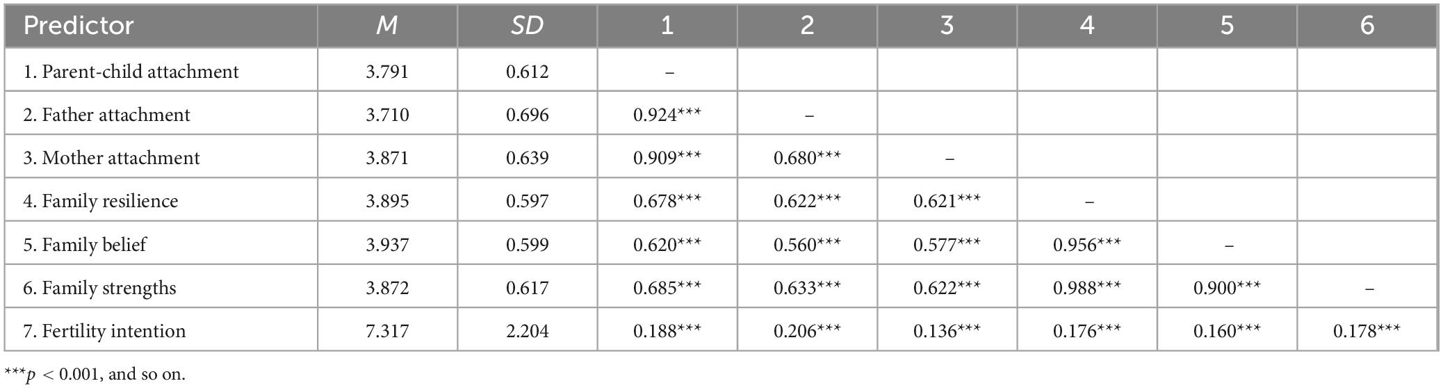 The analysis results (see Table 1) reveal significant correlations among the core variables in this study. Significant positive correlations exist between fertility intention and parent-child attachment, father-child attachment, mother-child attachment, family resilience, family beliefs, and family strength. Specifically: The correlation coefficient between parent-child attachment and fertility intention was 0.188 (p < 0.001, 95% CI [2.106, 2.256], Cohen’s d = 2.181), the correlation coefficient between father attachment and fertility intention was 0.206 (p < 0.001, 95% CI [2.132, 2.282], Cohen’s d = 2.207), the correlation coefficient between mother attachment and fertility intention was 0.136 (p < 0.001, 95% CI [2.049, 2.197], Cohen’s d = 2.123); the correlation coefficient between family resilience and fertility intention was 0.176 (p < 0.001, 95% CI [2.045, 2.193], Cohen’s d = 2.119); the correlation coefficient between family belief and fertility intention was 0.160 (p < 0.001, 95% CI [2.019, 2.167], Cohen’s d = 2.093); and the correlation coefficient between family strength and fertility intention was 0.178 (p < 0.001, 95% CI [2.055, 2.203], Cohen’s d = 2.129). These correlations were not only statistically significant (p < 0.001), but also had a 95% CI excluding 0 and Cohen’s d-values > 0.8, indicating that these correlations were small but of practical significance (Cohen, 1988).