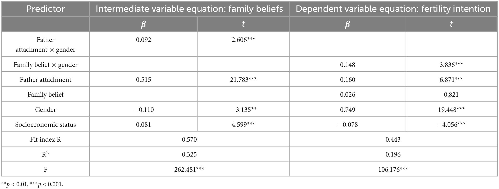 Gender showed significant moderating effects in both “father attachment → family belief” (stage 1) and “family belief → childbearing intention” (Stage 2), and the moderating patterns were significantly different between genders.